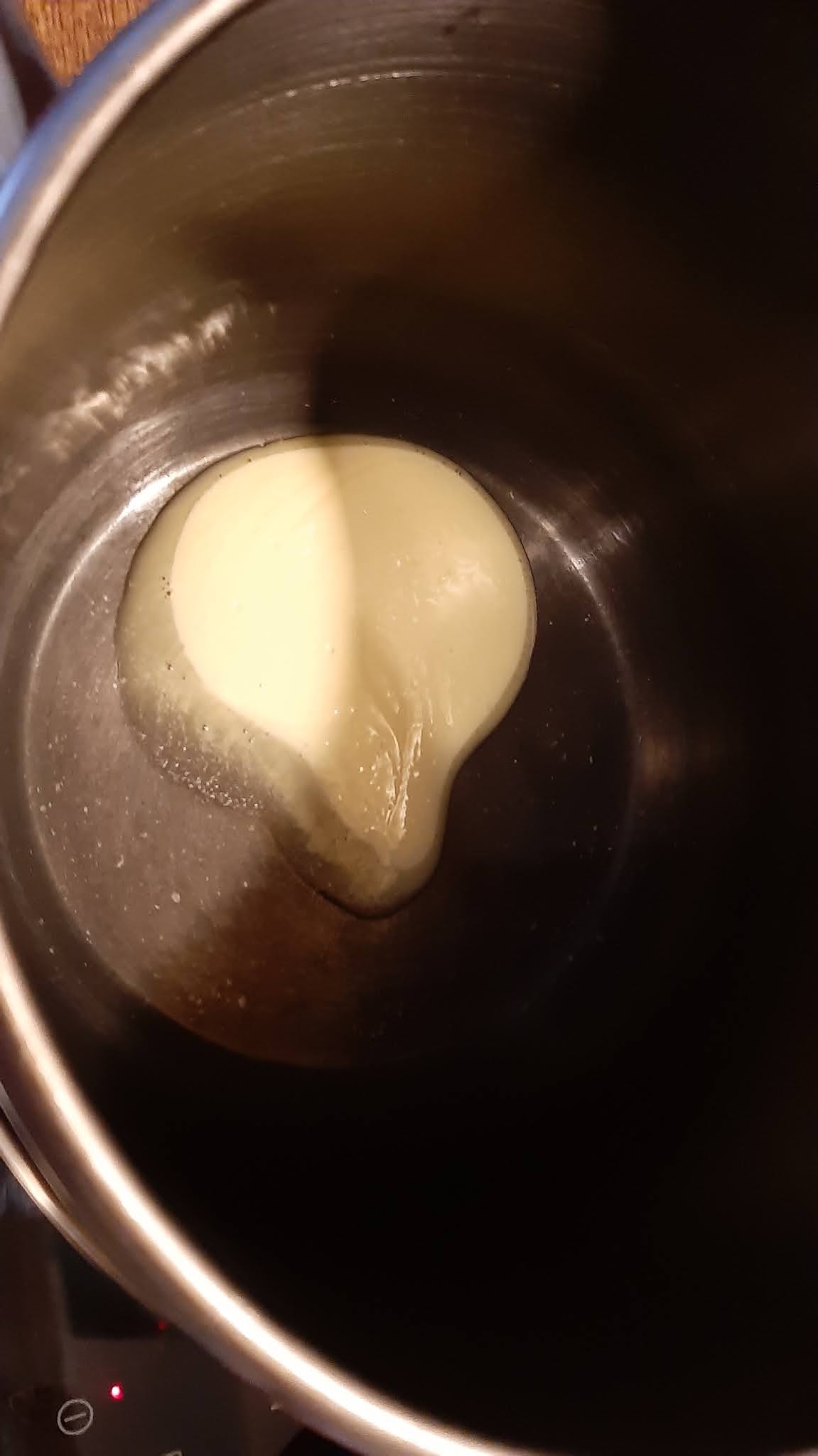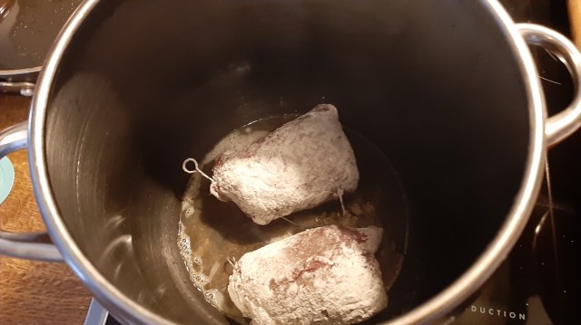 - На дъното на тенджерата отмерих Butterschmalz. Това масло съм се научила от немските баби да използвам. То е много подходящо за пържене на месо. Не пръска, а и дава невероятен вкус и мекота на месото.