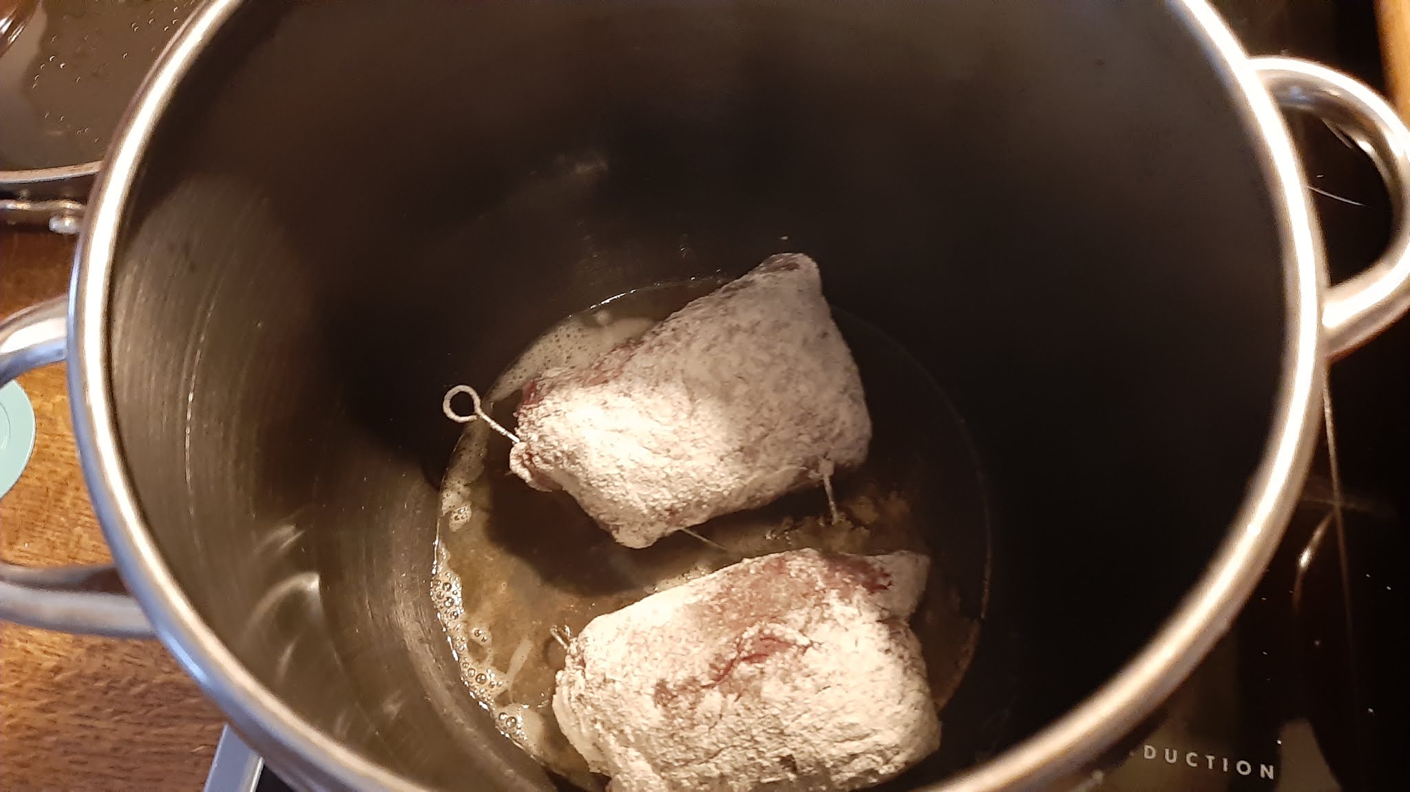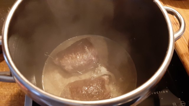 - Залях руладините с горещ телешки бульон и захлупих тенджерата. Варих около 40 минути. Ако нямате тенджера под налягане ще се нуждаете от 2 часа на слаб котлон, за да са готови. Аз приготвих 2 бр., защото не обичаме да повтаряме храна, но рецептата е за 4 бр.