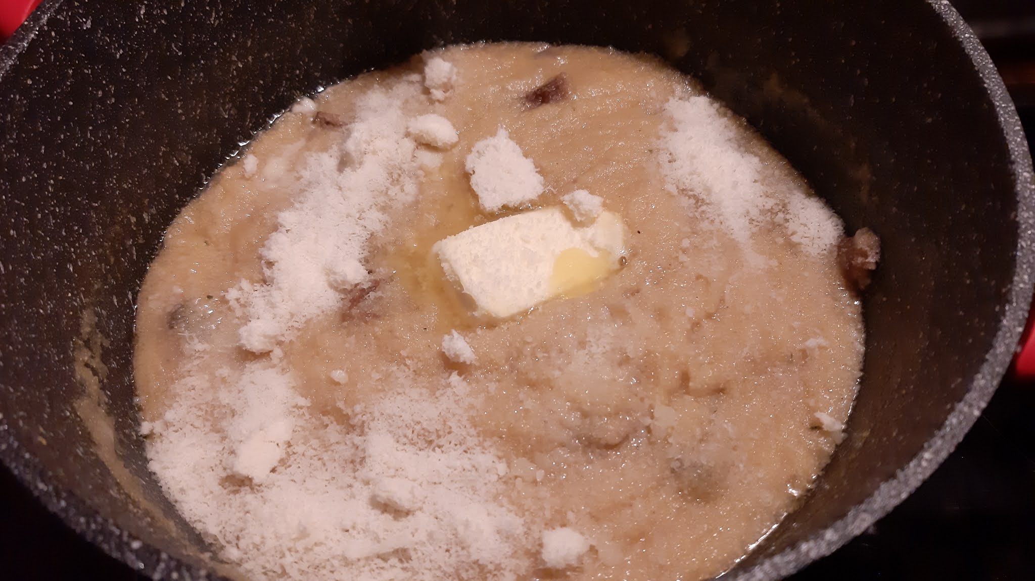 - Към готовата полента добавих маслото и пармезана. Разбърках.