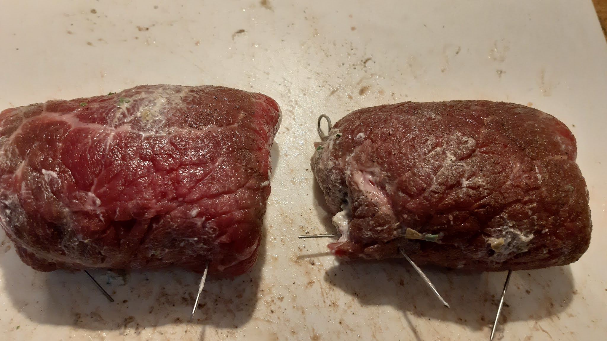 4 специални говежди месца около 150 – 200 гр всяко, които или купувате специално за руладини от немските магазини или поръчвате на месаря да Ви ги отреже. Трябда да са около 5 см тънки, но…много дълги – поне 30 см и достатъчно широки. Мисля, че са част от бута на говедото или телето