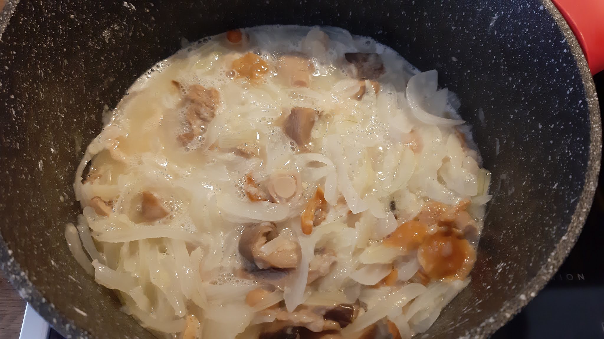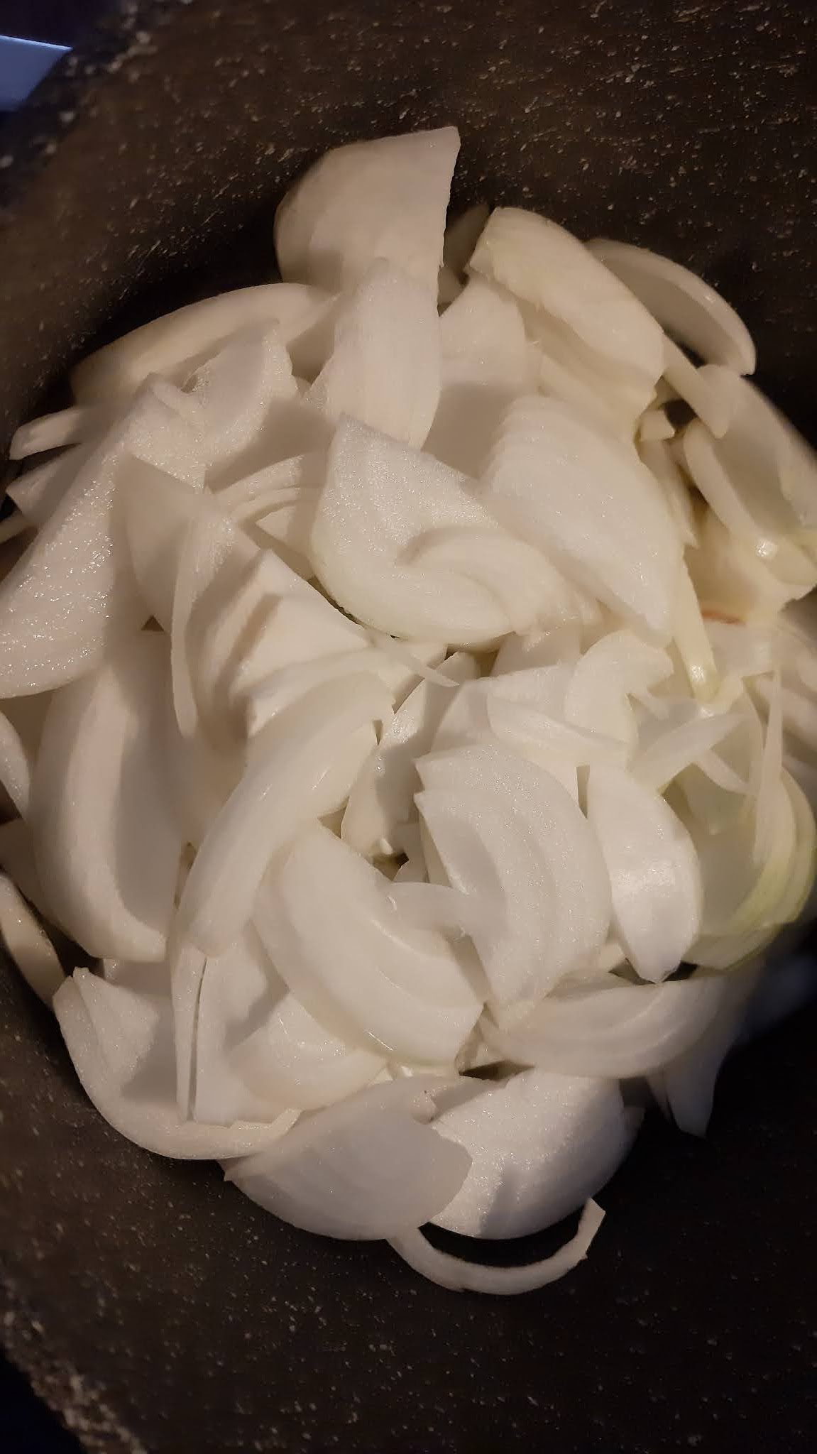 - Загрях маслото в голяма тенджера и задуших на средна мощност на котлона, под капак и за около 10 минути нарязаният на лентички кромид лук.