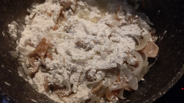 - След 1 минута поръсих с брашното и пържих още 1 минута.