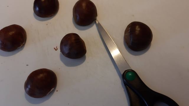 - С много остър нож или по-скоро с нож за тапети, отрежете прорез на Х в заоблената част на кестена.