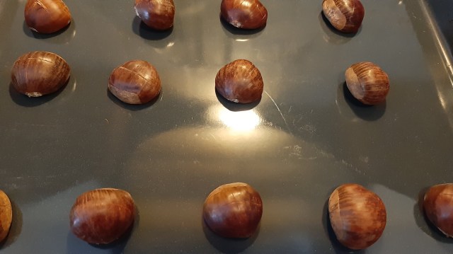- Подредете кестените в тавата на фурната върху плоската част и с разреза нагоре.