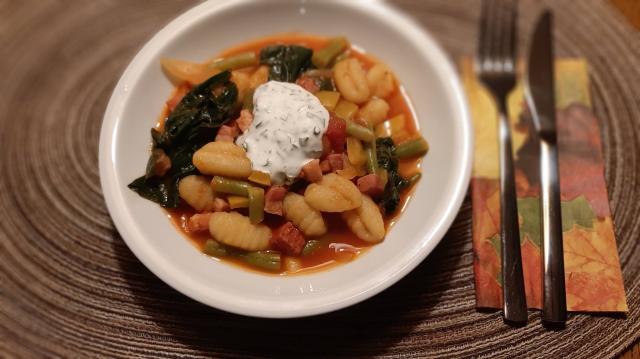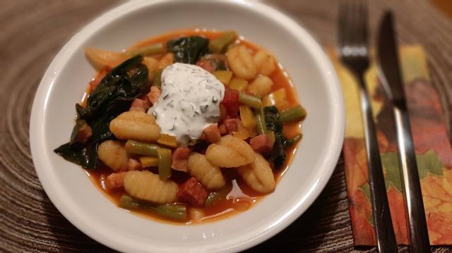 Освен, че има ньоки, добавихи изобилие от зеленчуци и малко бекон и чоризо за допълнителен аромат и вкус.