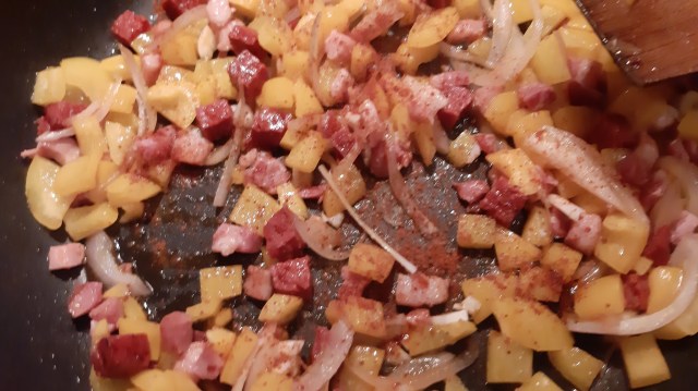 - В сух тиганн и на средна мощност на котлона запържвам кубчетата бекон и кубчетата чоризо за около 5 минути. Ароматът е невероятен.