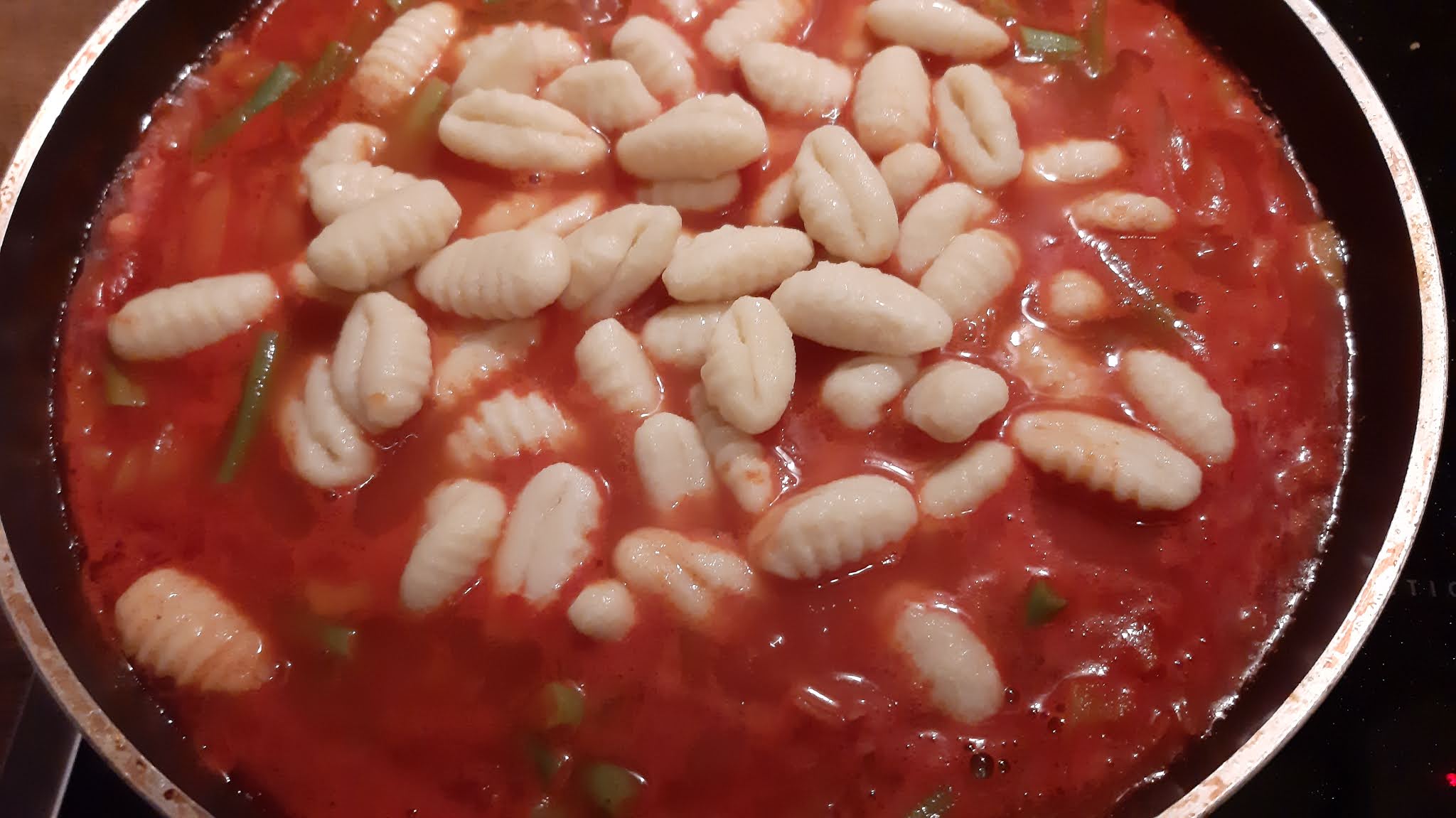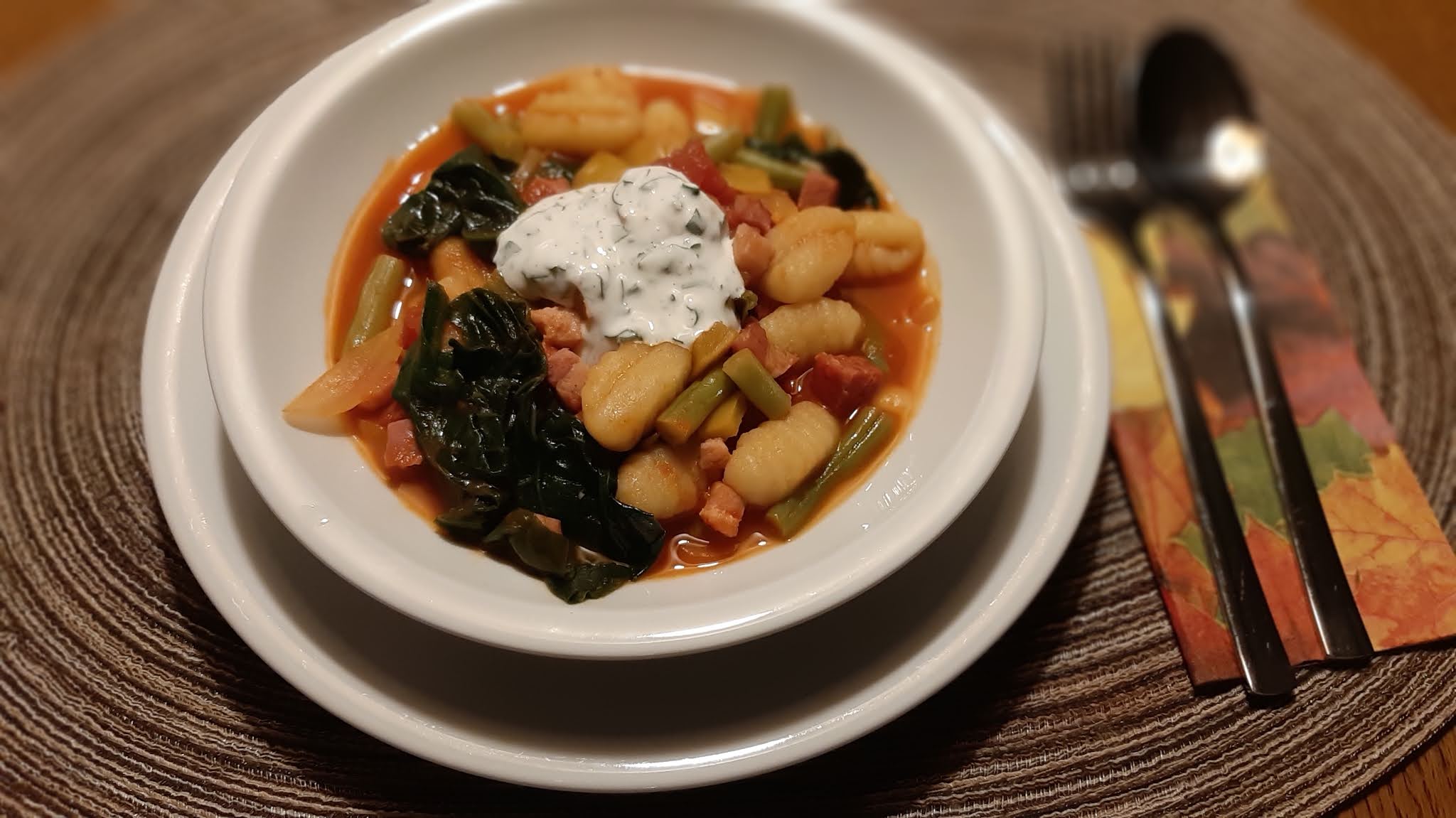 Освен, че има ньоки, добавихи изобилие от зеленчуци и малко бекон и чоризо за допълнителен аромат и вкус.