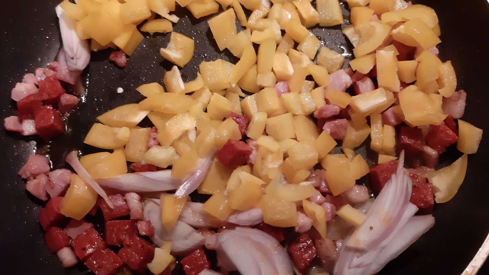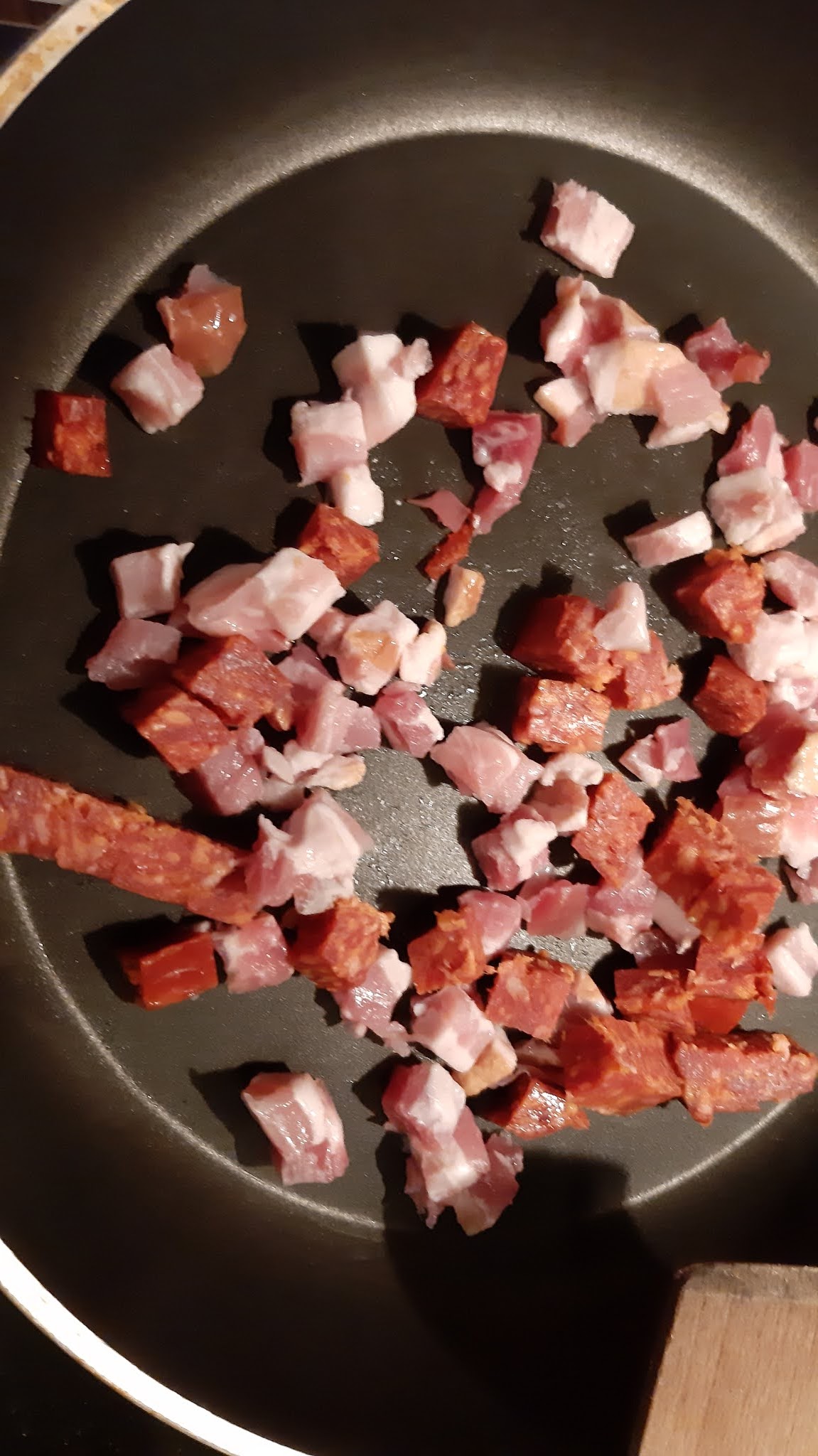 - В сух тиганн и на средна мощност на котлона запържвам кубчетата бекон и кубчетата чоризо за около 5 минути. Ароматът е невероятен.