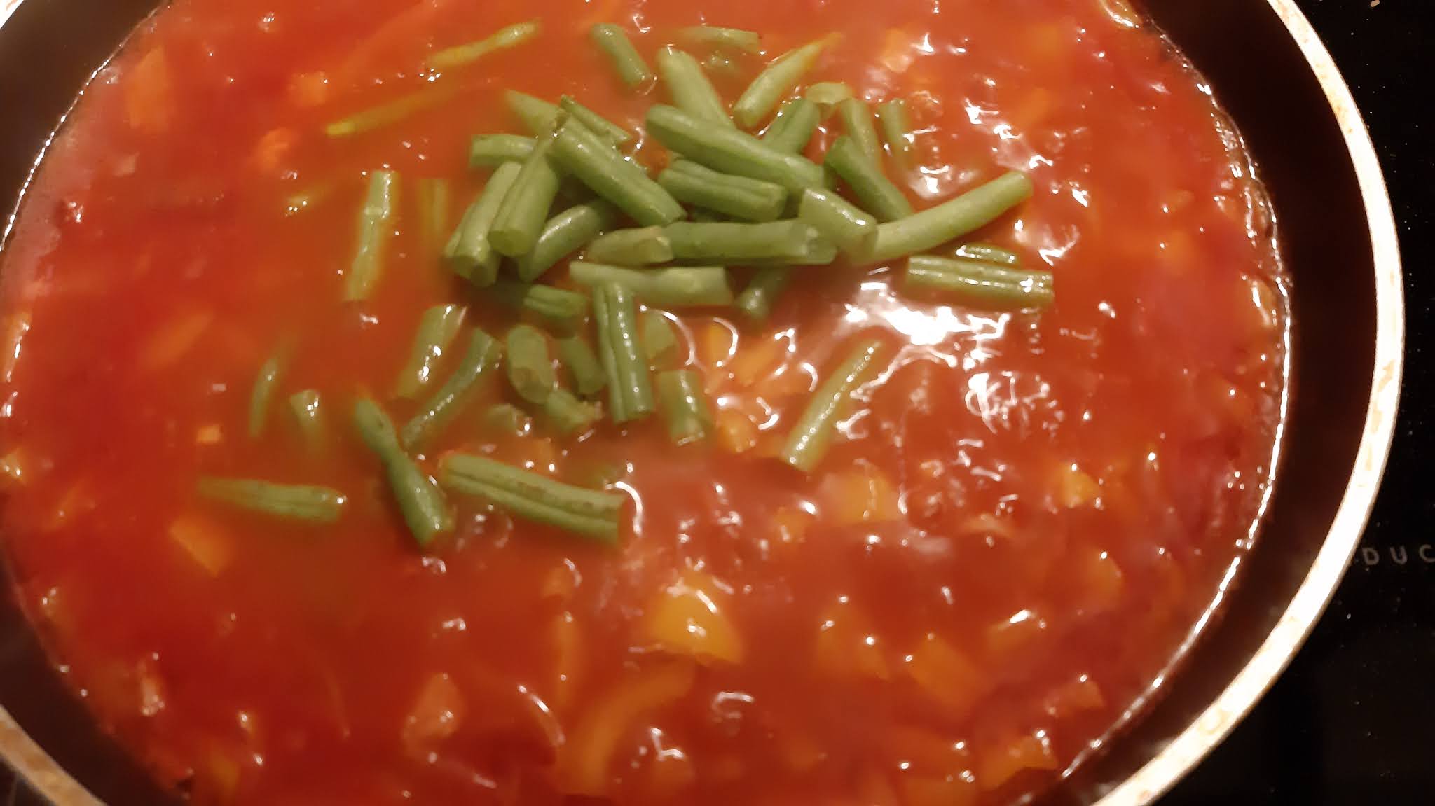 - Като минат 5 минути добавям почистения и нарязан на 2 см големи парчета зелен фасул, и засичам още 5 минути.