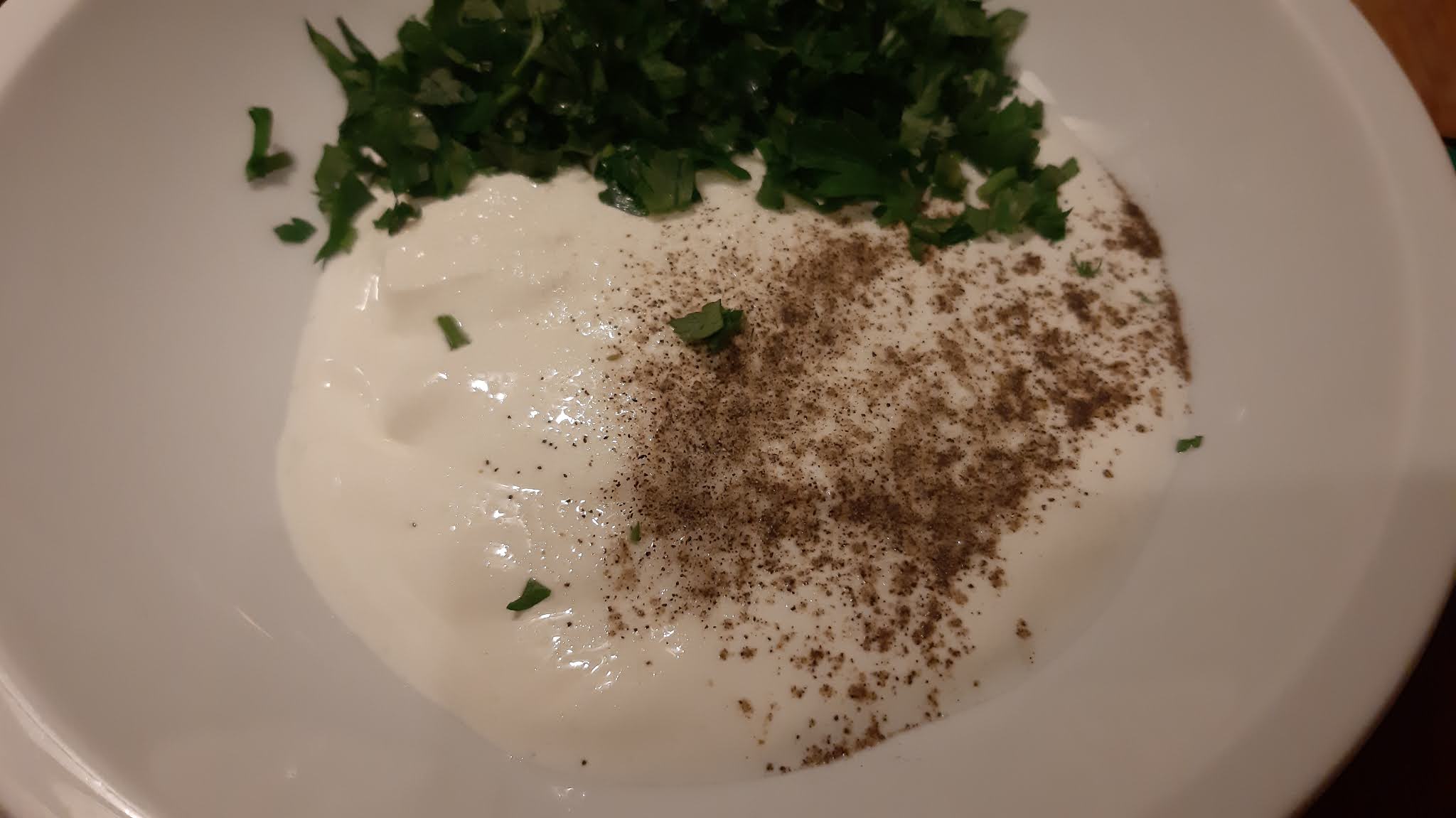 - През това време в купа смесвам сметаната с нарязаните на ситно зелени подправки. Подправям със сол и черен пипер на вкус.