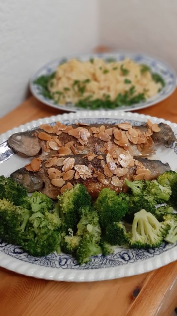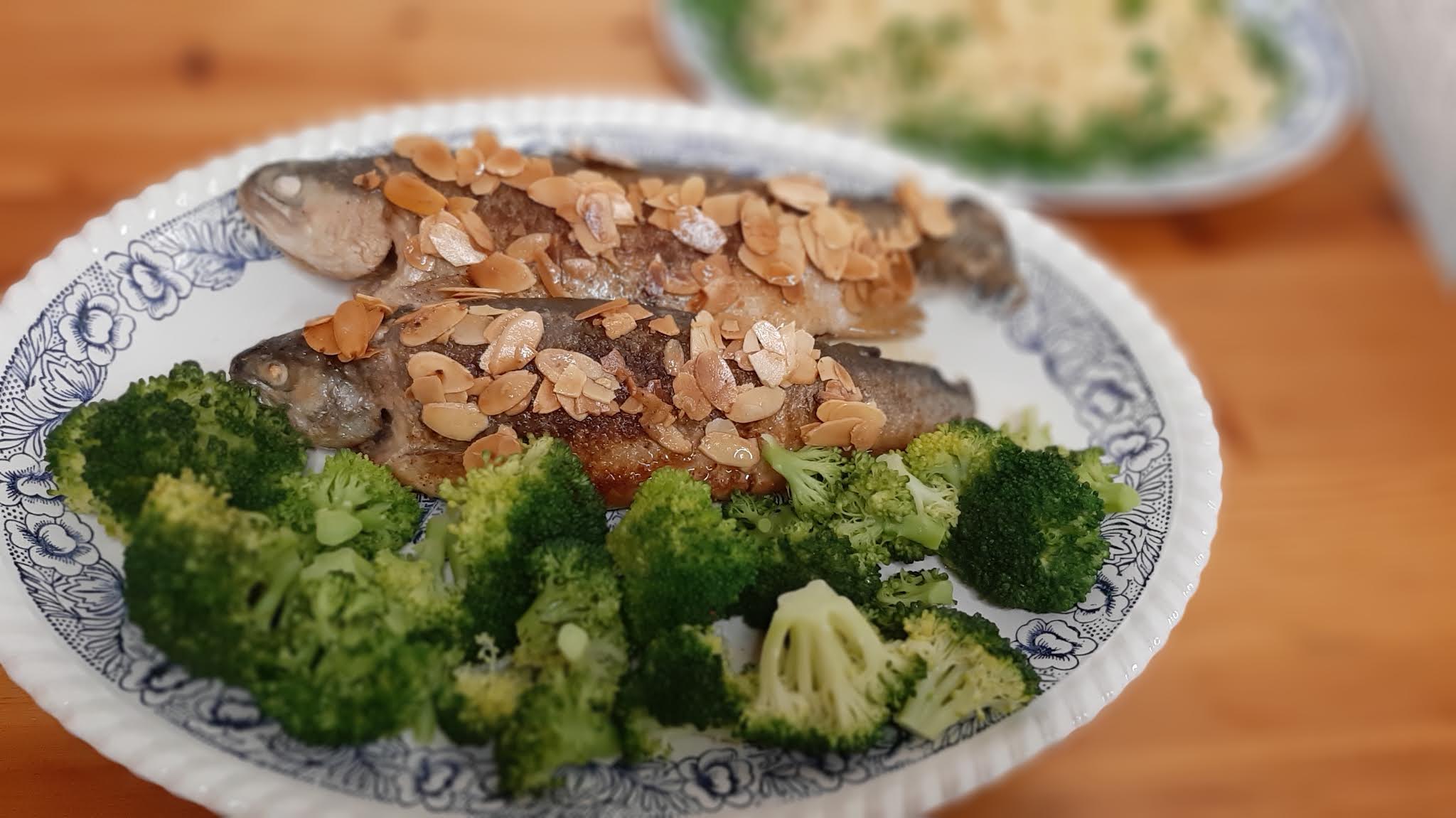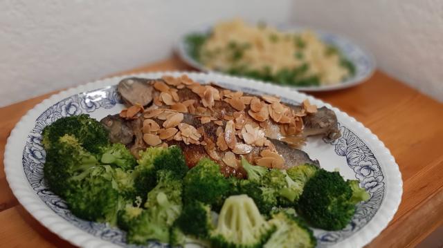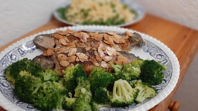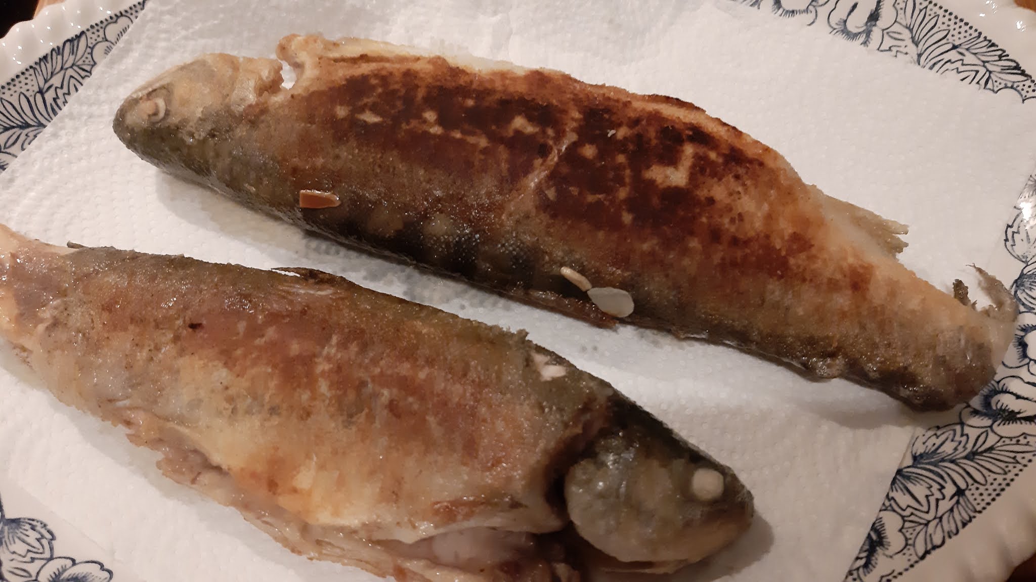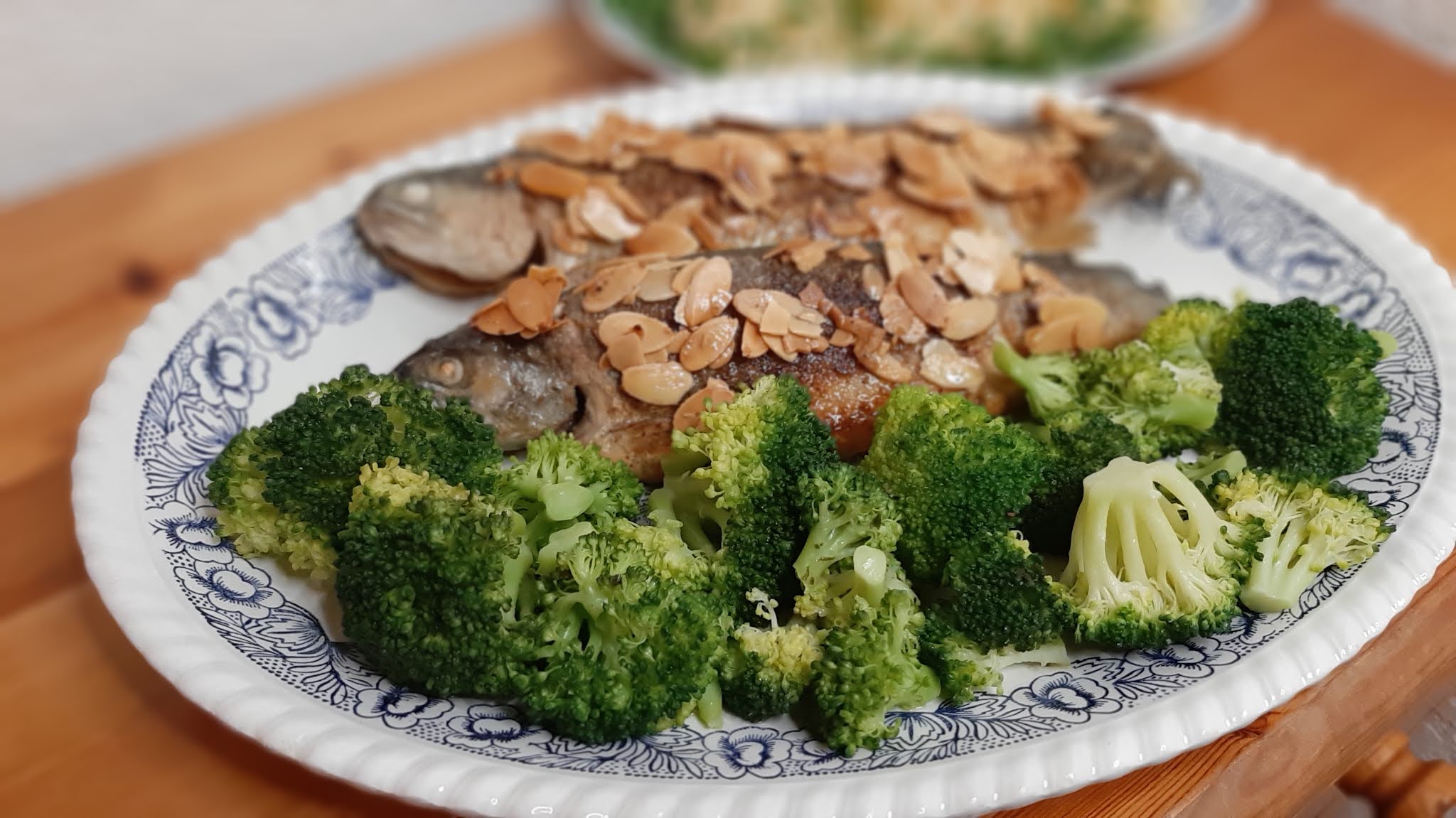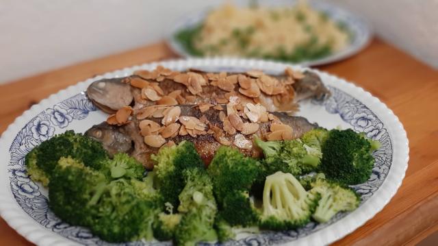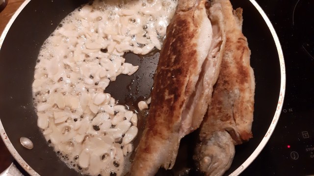 - 3 минути, преди да е готова рибата, добавих и бадемовите листа, за да се изпържат и те до златисто.