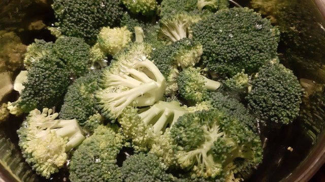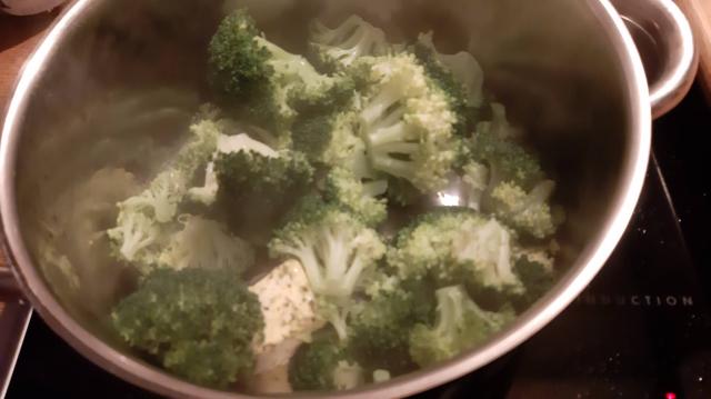 - Готовото броколи изцеждам от водата и веднага връщам в горещата тенджера, заедно с маслото. Похлупвам и го оставям на котлона, докато поема остатъчната влага (пара) от готвенето до сега.
