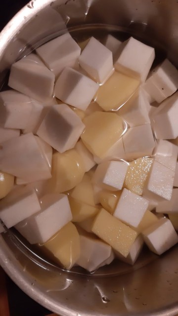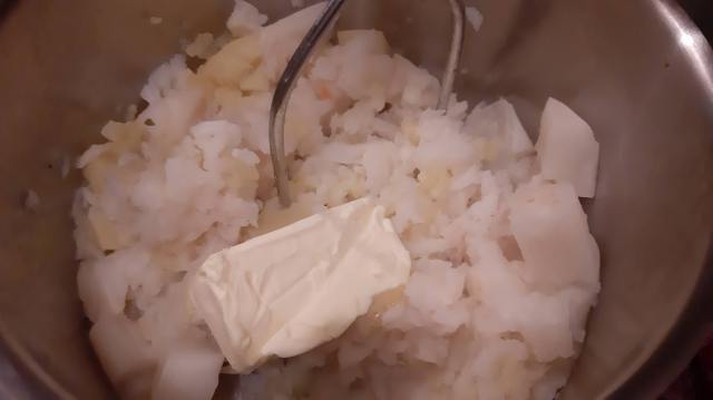 - Сварената целина, заедно с картофите отцеждам от водата и намачквам. Не се старая да бъде гладко пюре, защото това е стампот. Трябва да е на бучки.