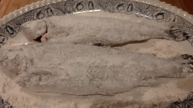 - Рибата овалам от всички страни в брашно, но излишното изтупвам много добре. Това е важно.