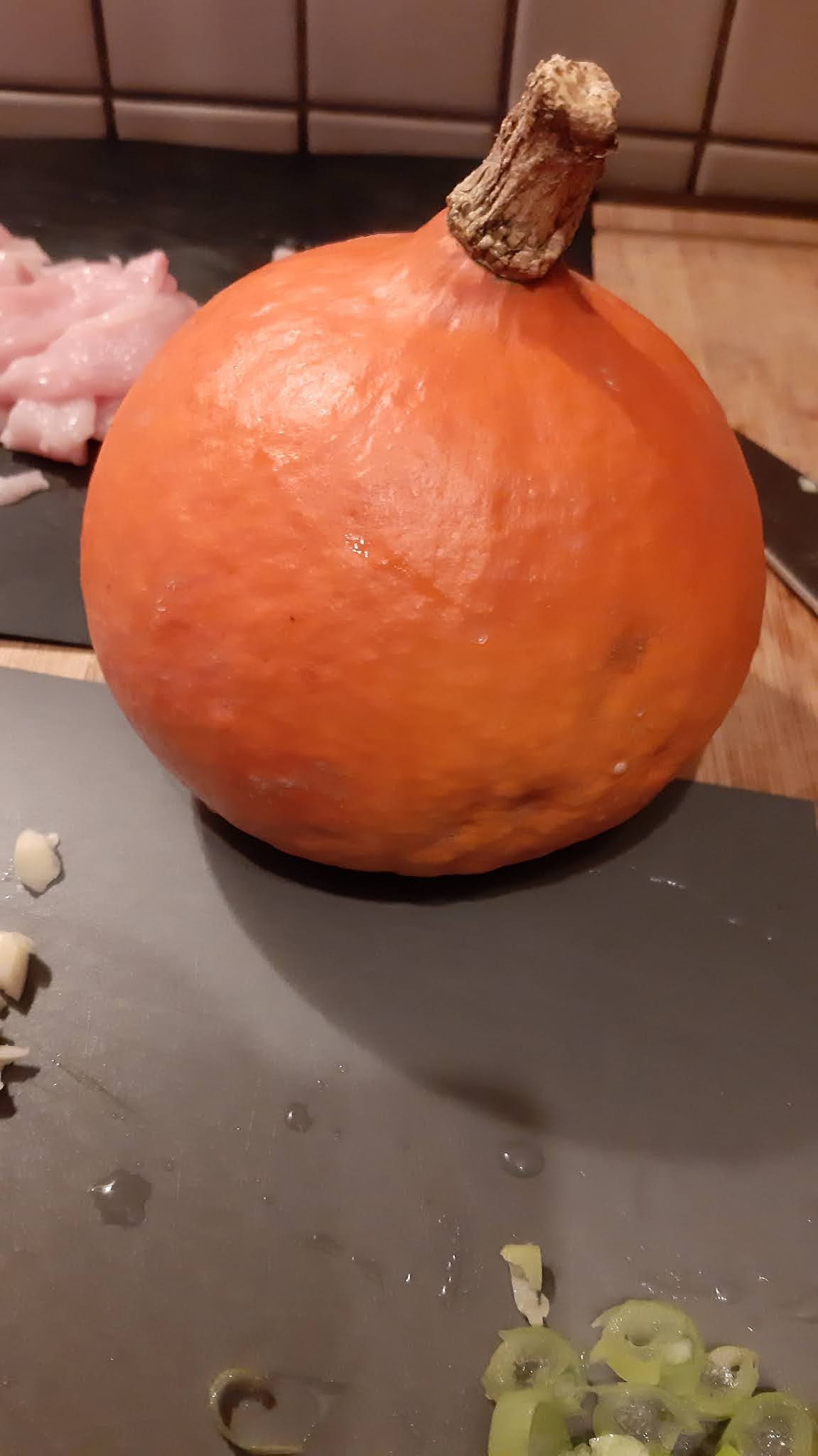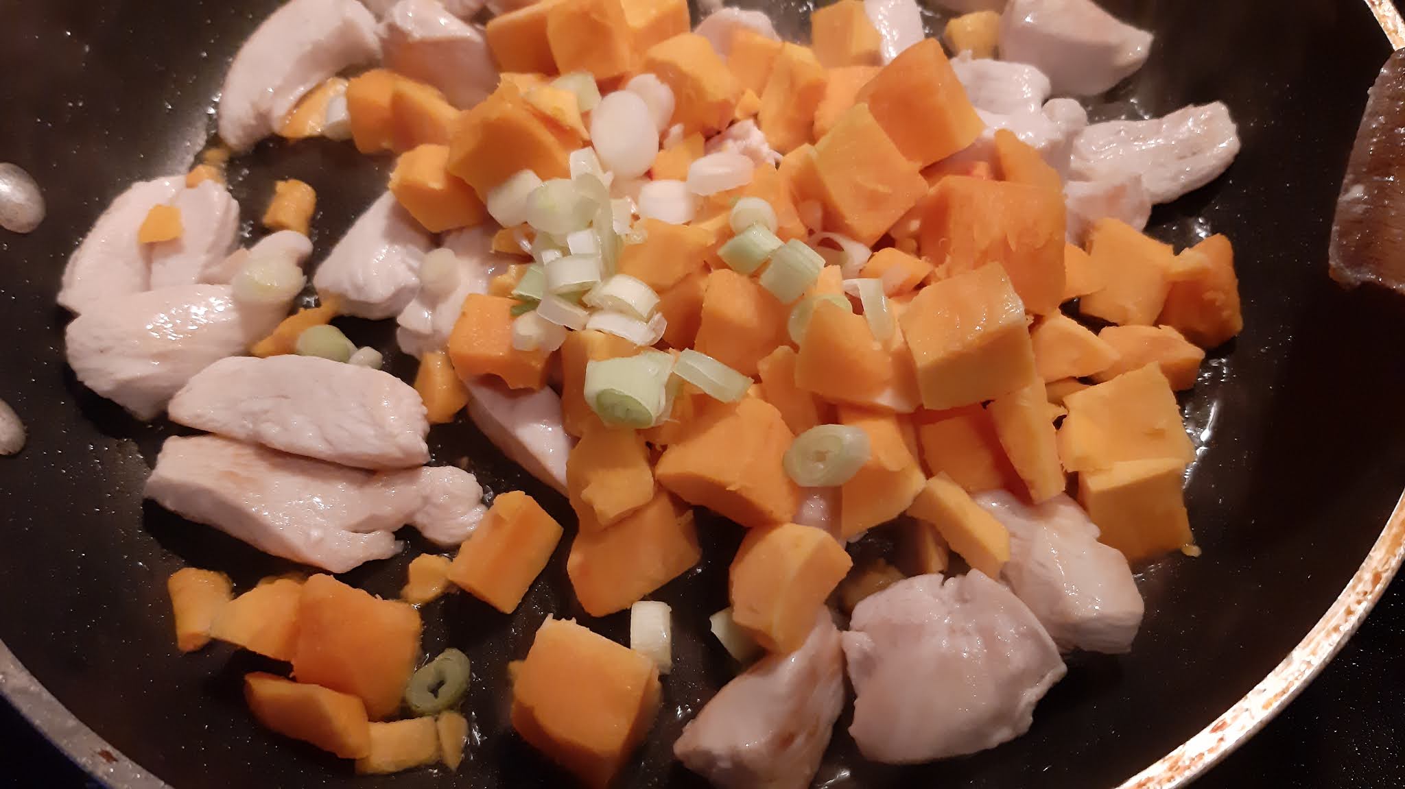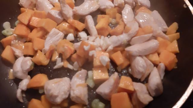- Към пилешките късчета добавих бялата част на зеления лук, нарязан на колелца и кубчетата тиква.