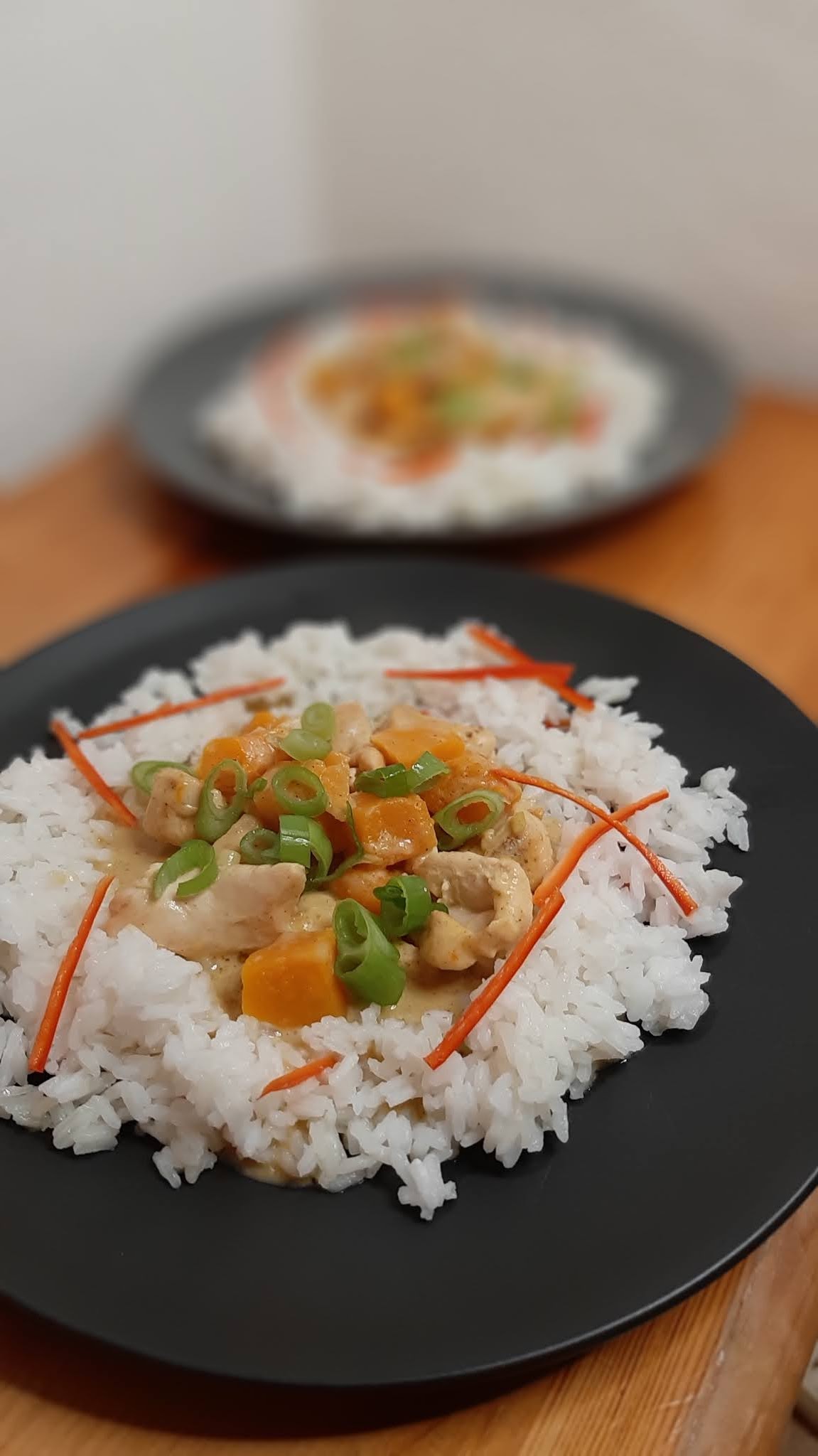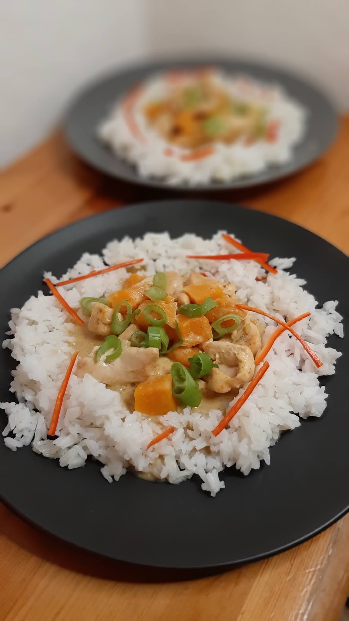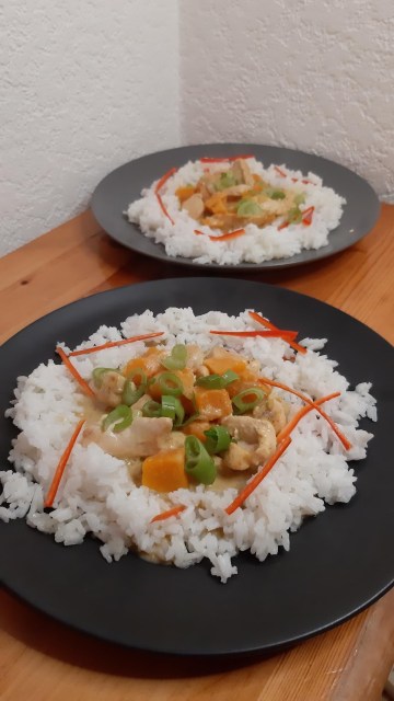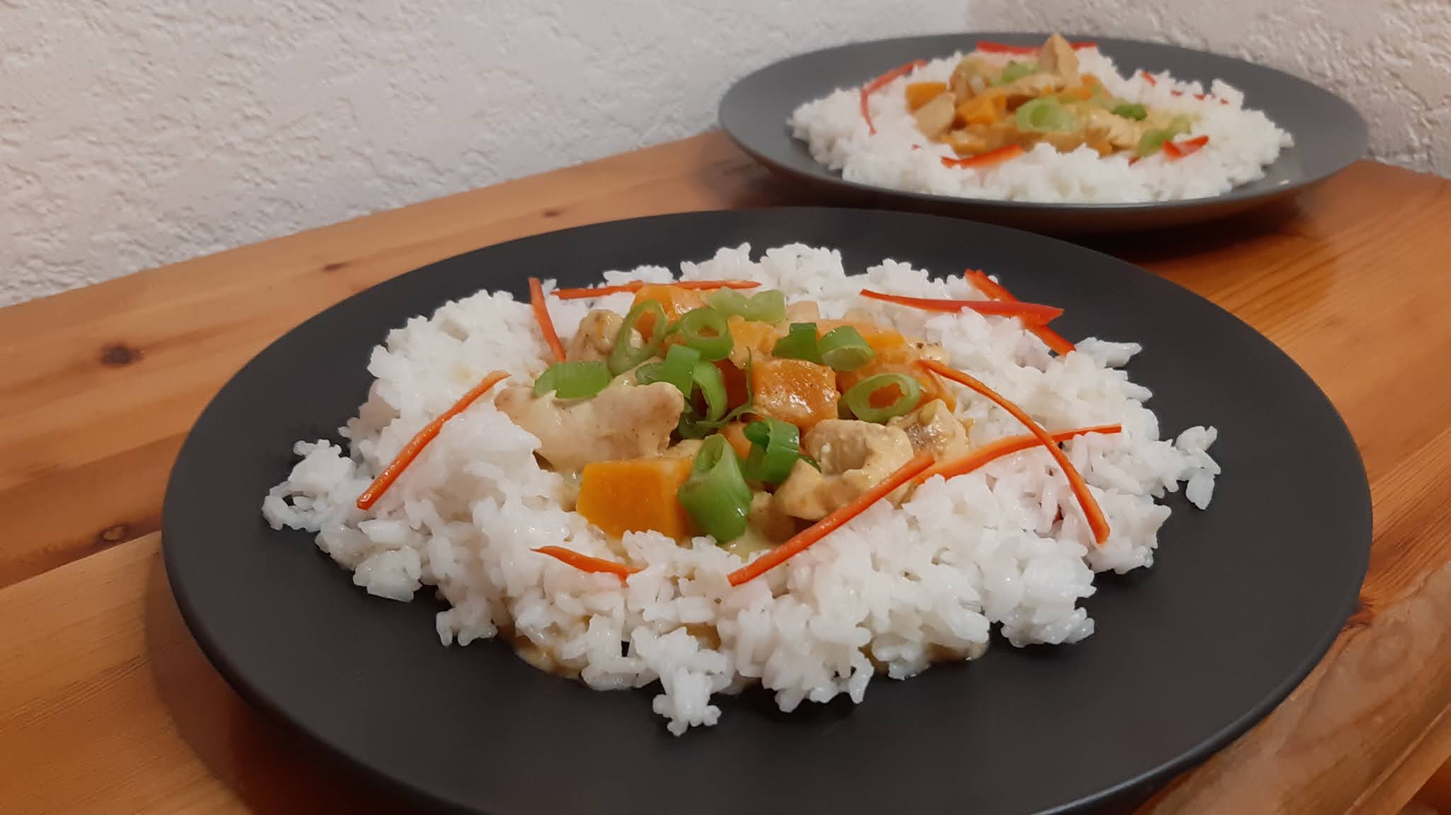 Серирам вкусното къри с тиква върху жасминовия ориз и поръсвам с колелца от зелената част на зеления лук.
