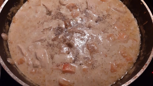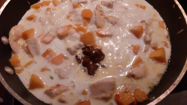 - Добавих къри пастата и залях с кокосовото мляко и бульона.