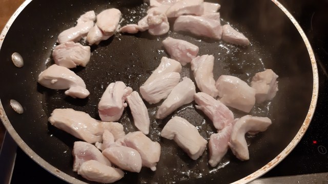 - Загрях олиото в тиган и изпържих на силен котлон пилето до зачервяване за около 4 минути.