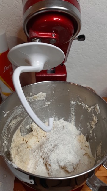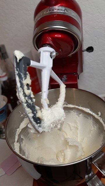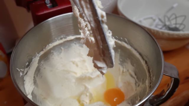 - Преминавам на бъркалка за тесто и добавям брашното на два пъти.