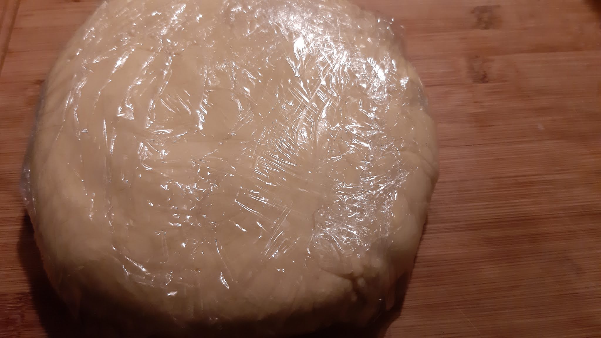 - Тестото доомесих на ръка и оформих на топка, която увих във фолио за свежо съхранение.