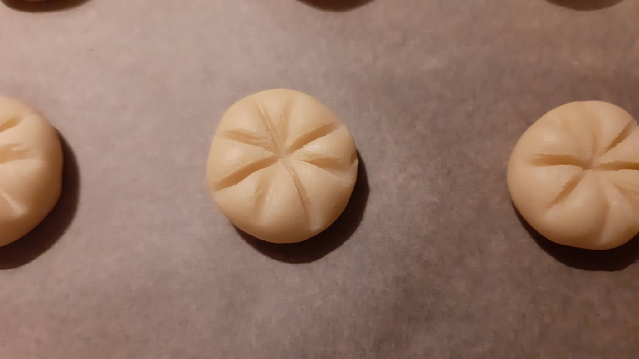 - После от твърдото тесто оформих топченца малко по-големи от лешник, които подредих в тава с хартия за печене.
