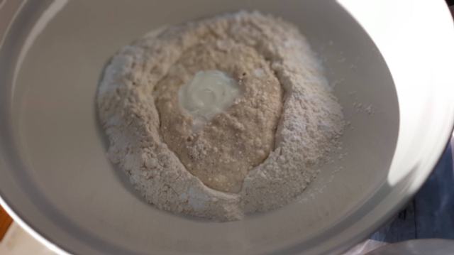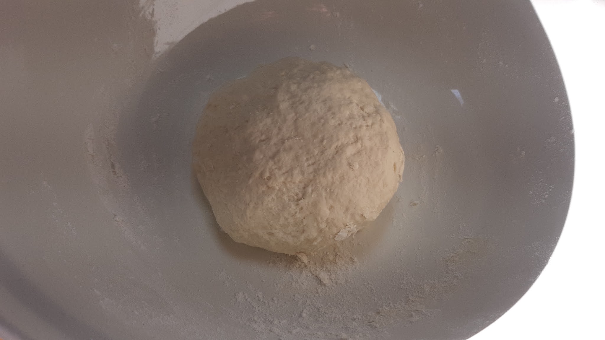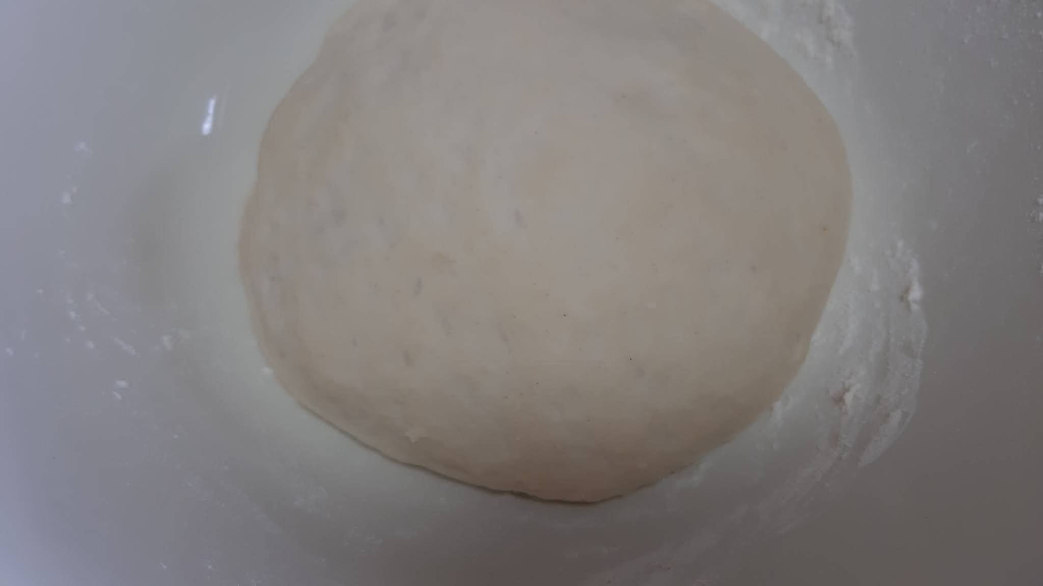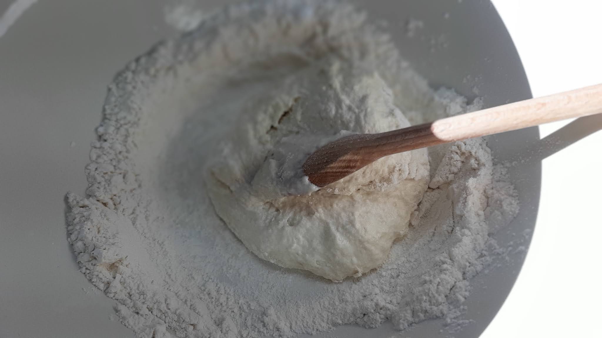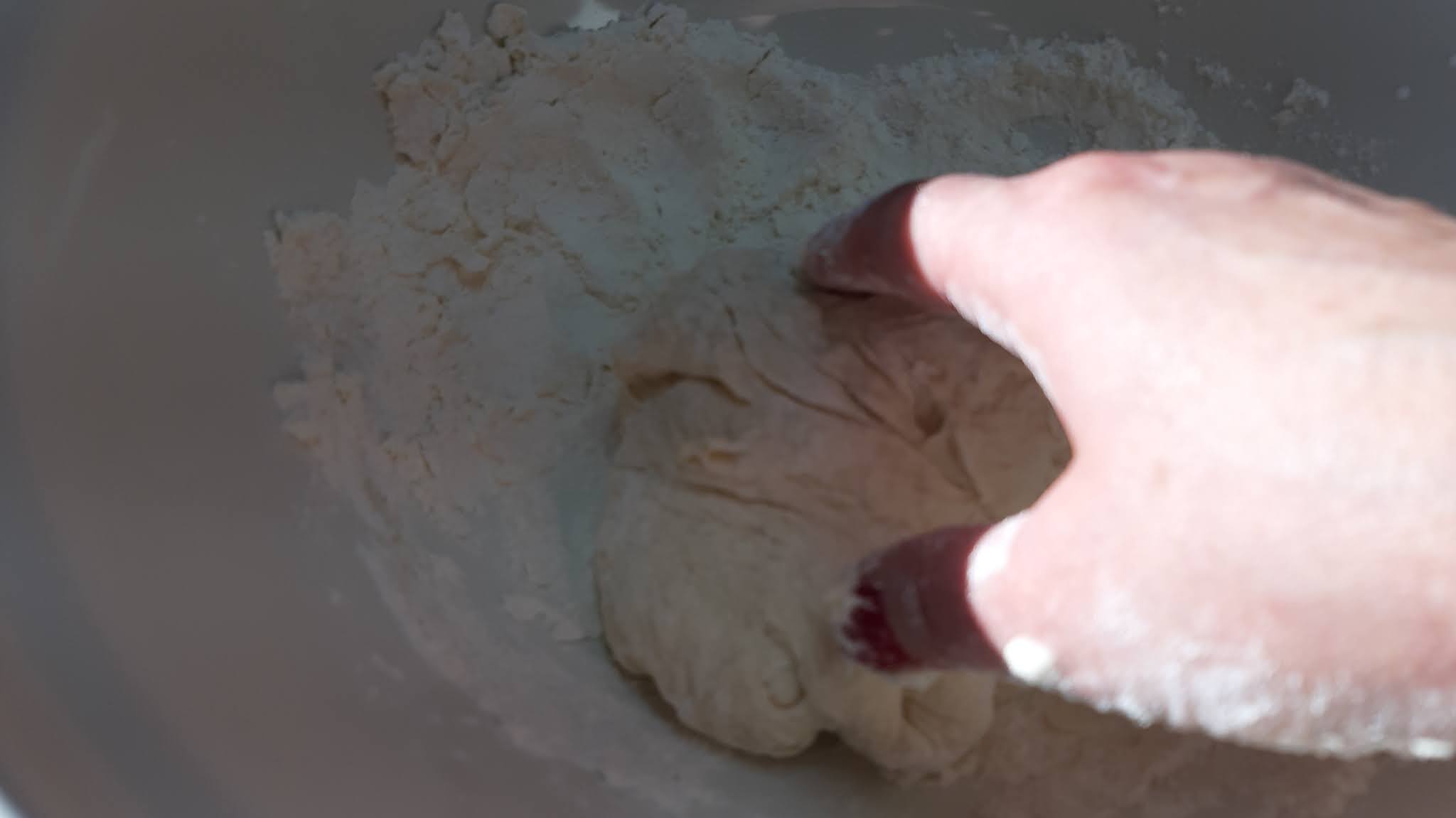 - Продължих месенето на ръка до пълното усвояване на брашното. Моето е бяло ТИП 405, най-евтиното на немския пазар. Количеството течност беше точно за 250 гр брашно.