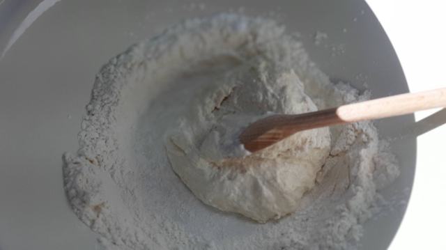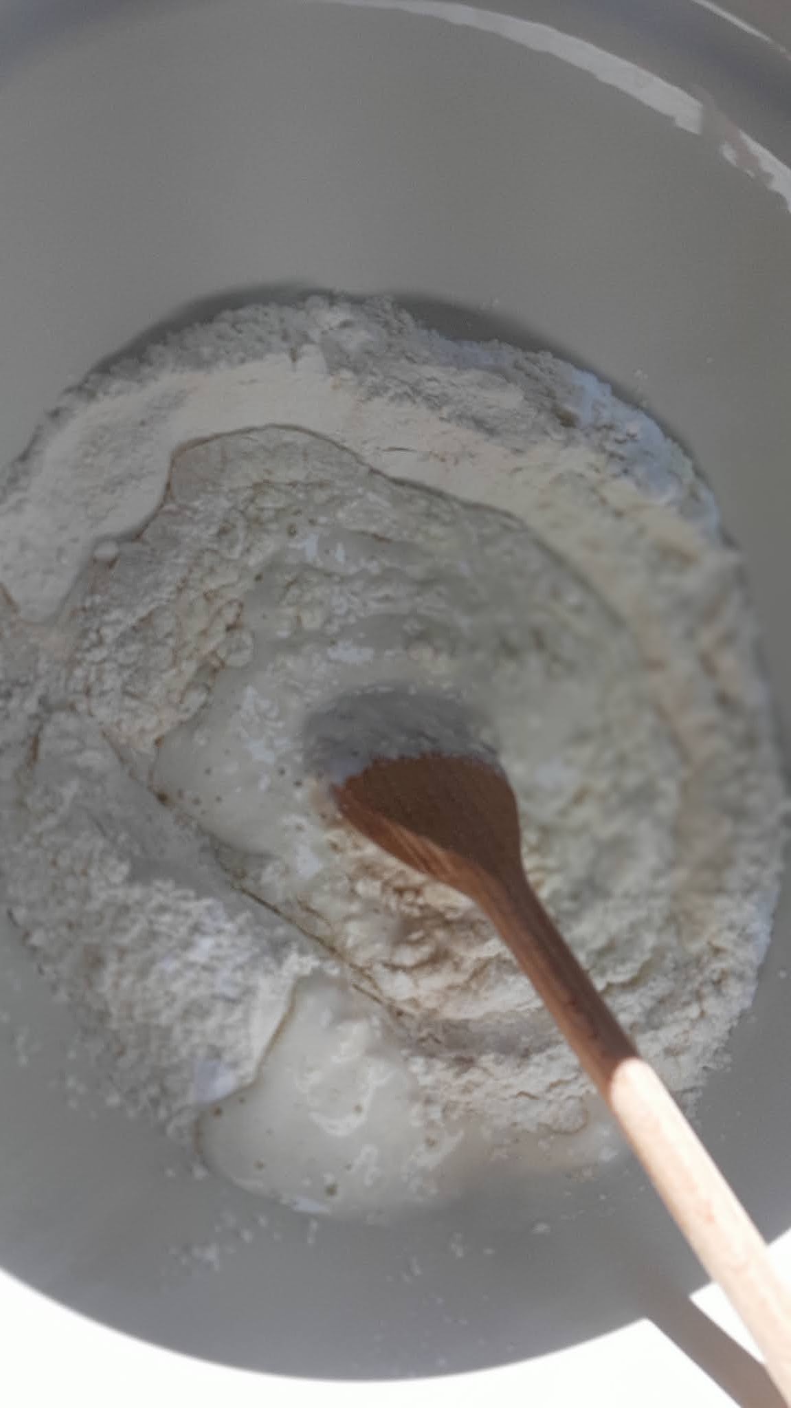 - Не ми се цапаше миксер за толкова малко тесто и по старата технология на моята майка, заедно с дървената лъжица леко, леко започнах да бъркам и да загребвам от брашното.
