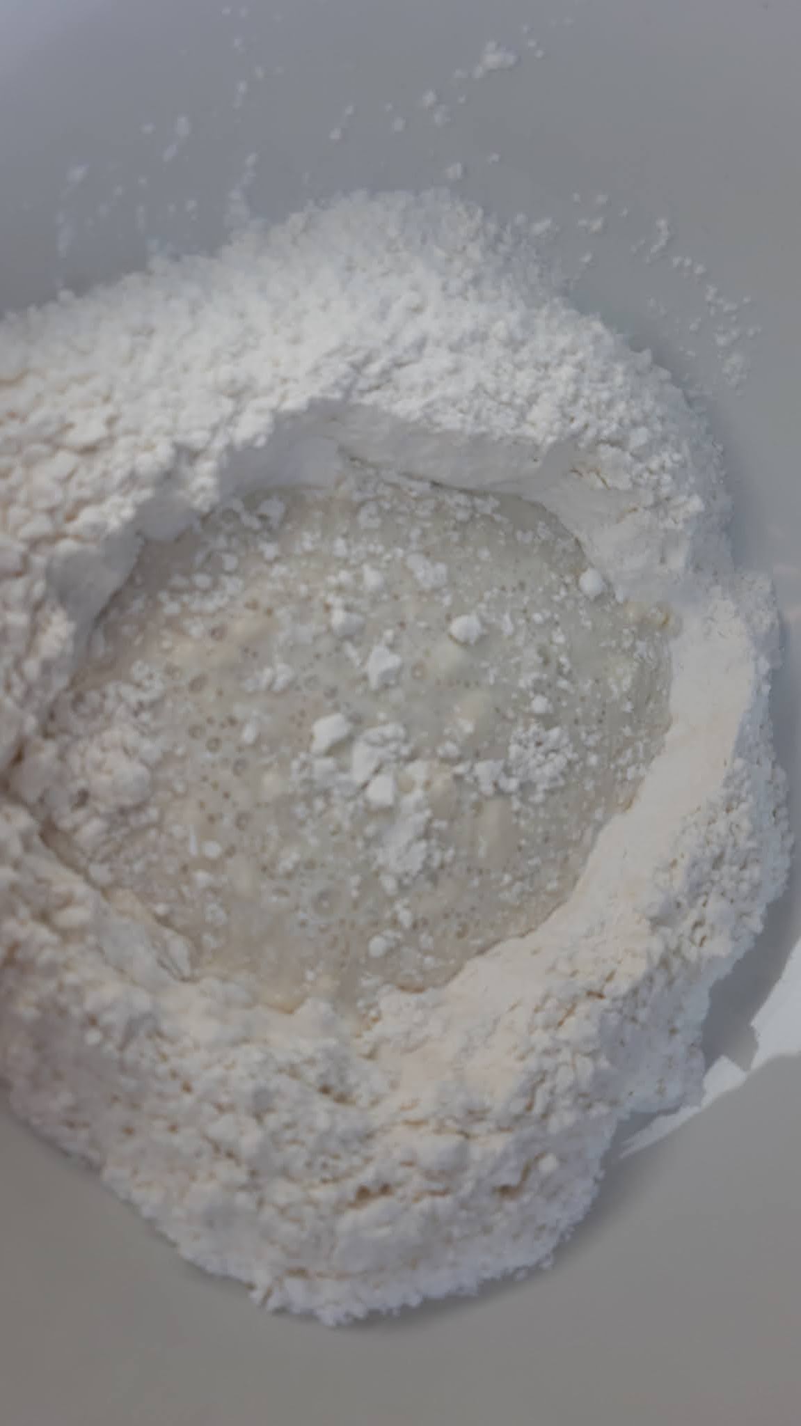 - В голяма купа отмерих брашното и в средата направих кладенче.