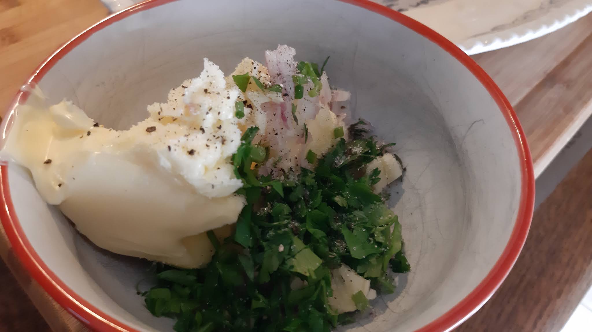 Например, за пиле Киев добавям и бекон, който дава един опушен и неповторим вкус, но може да преобладава чесън, може да преобладава розмарин или просто копър. Това решавате Вие.