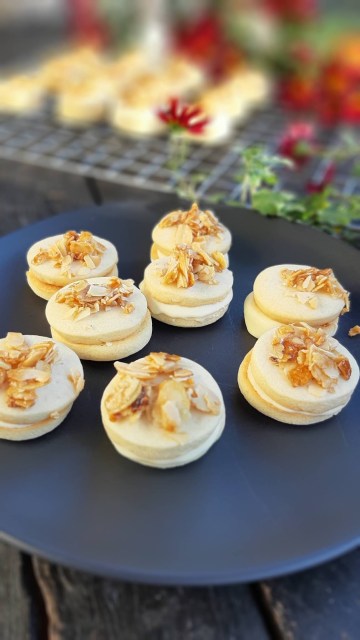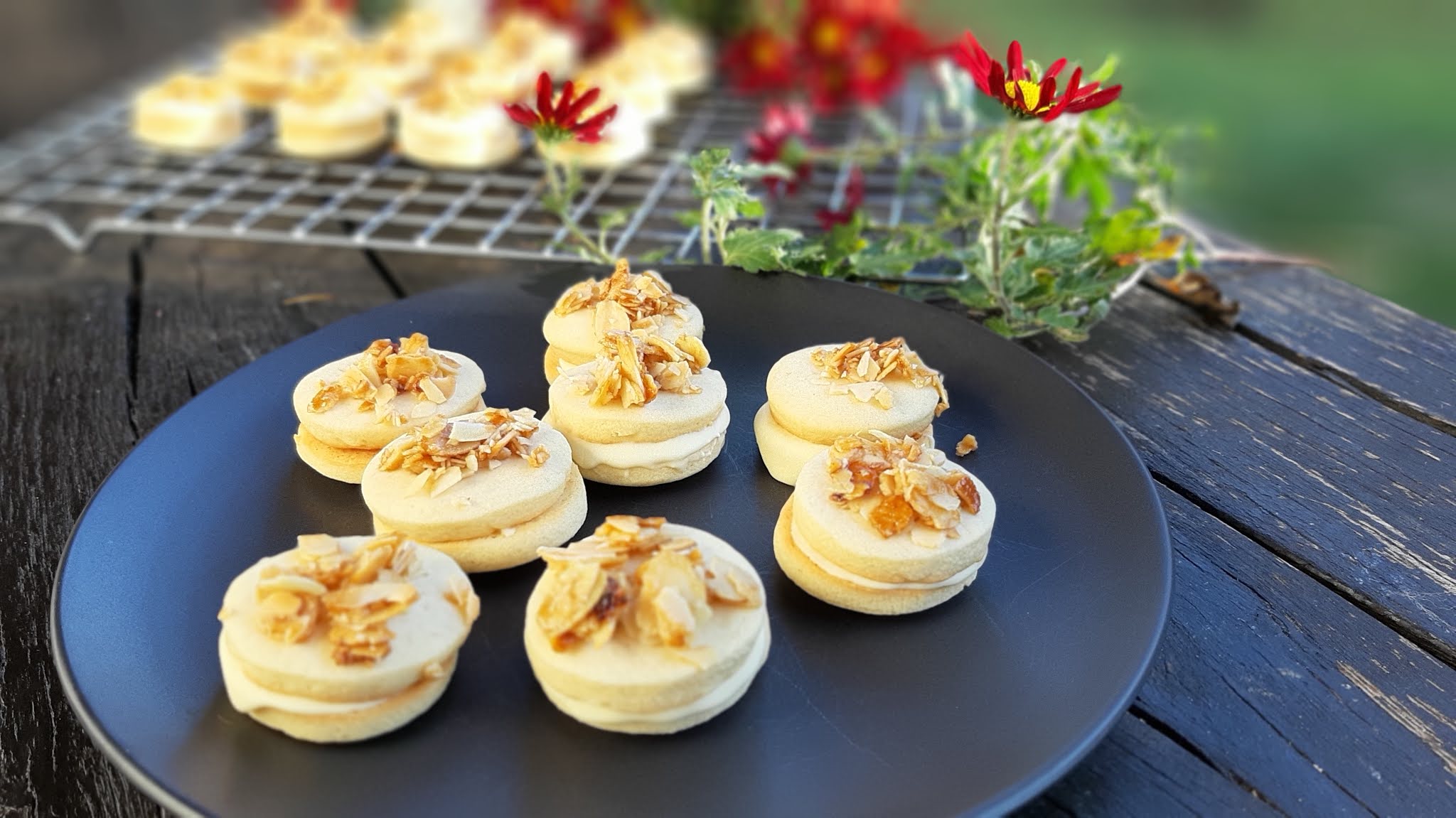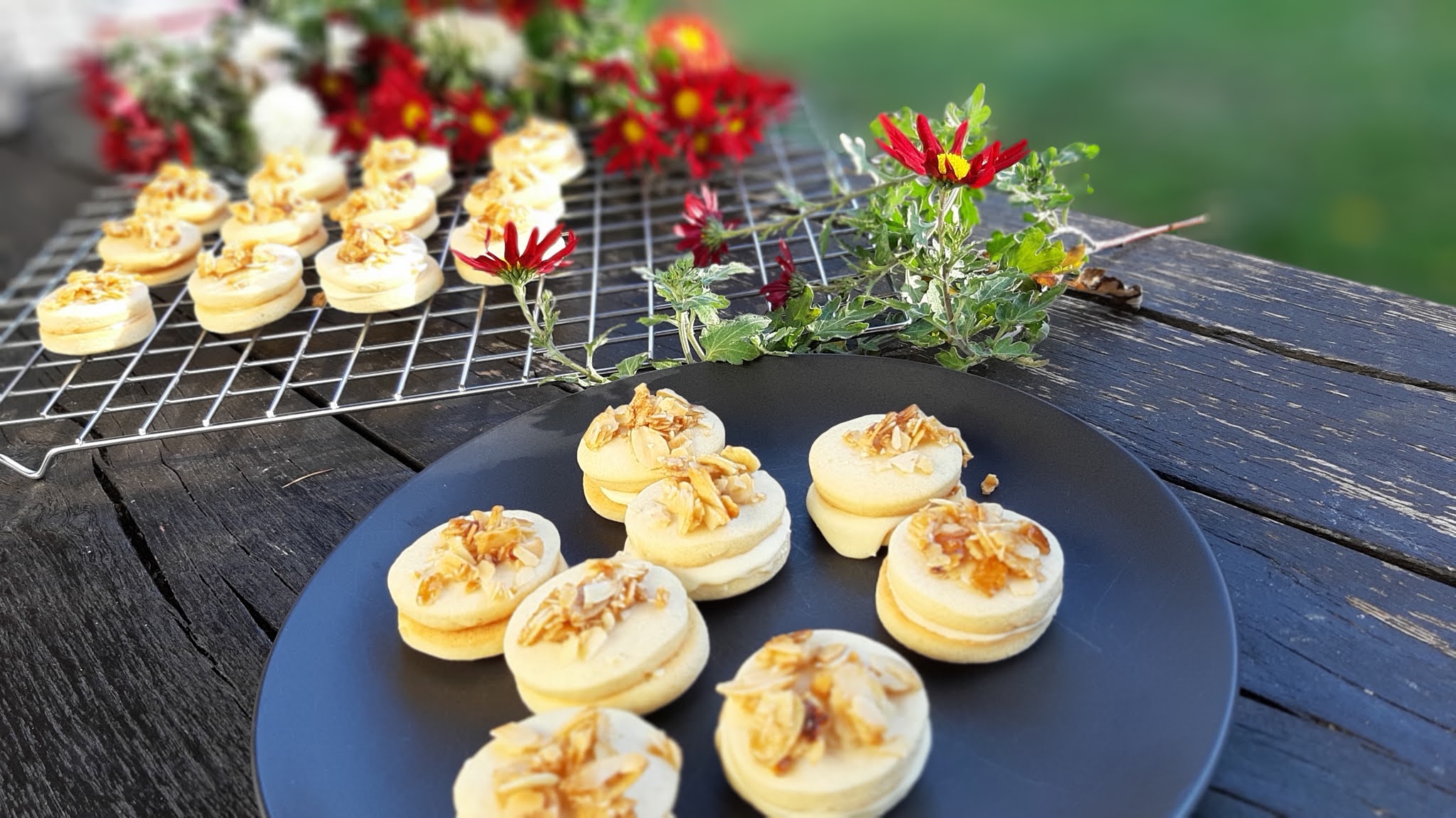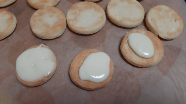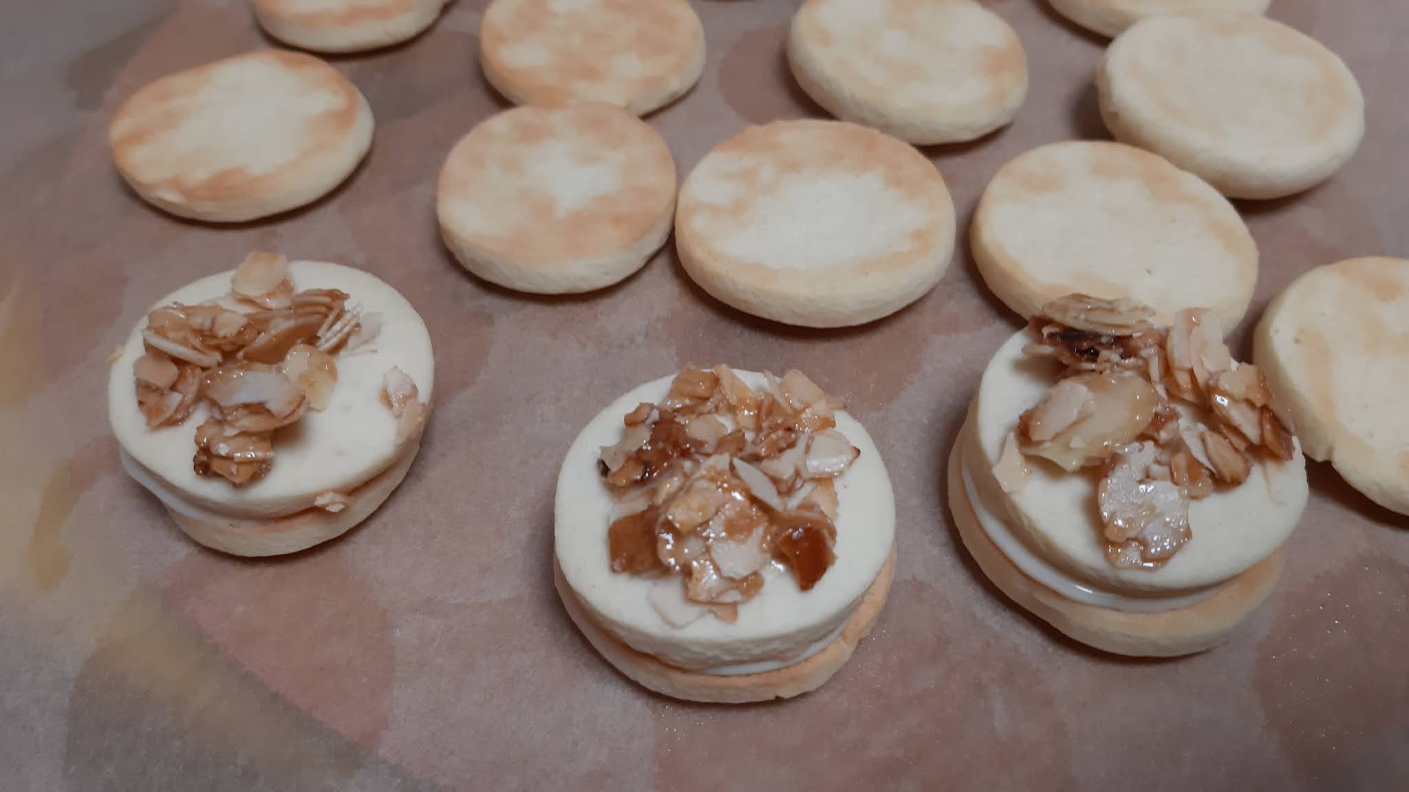 • На половината сладки от обратната страна слагам крем и покривам с бадемовите сладки.