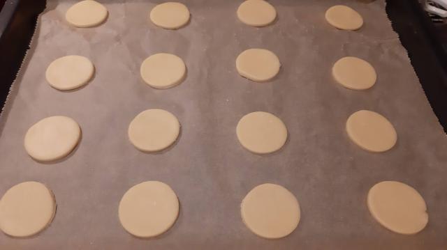 • В тавата с хартия за печене подредих на достатъчно разстояние сладките.