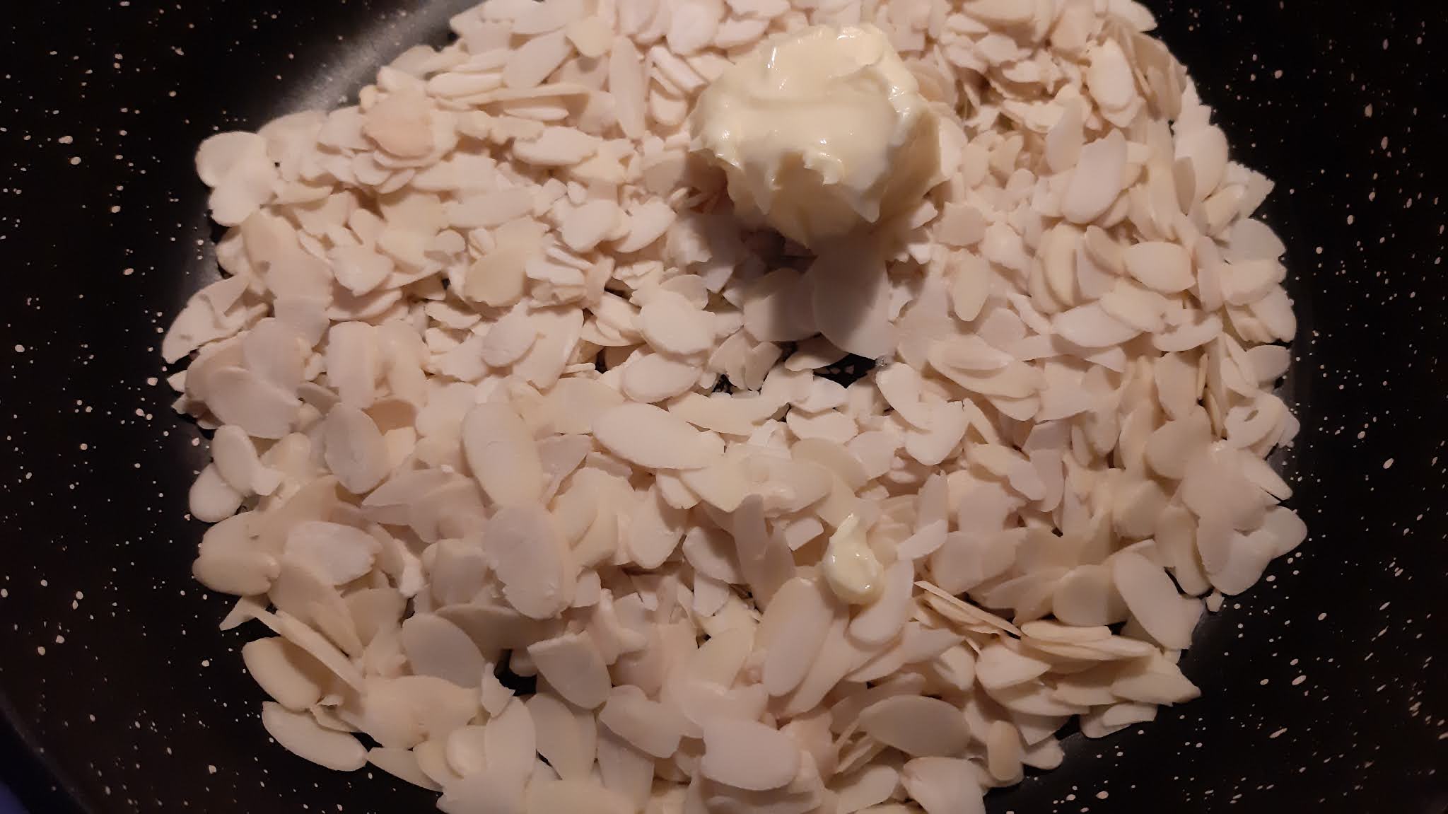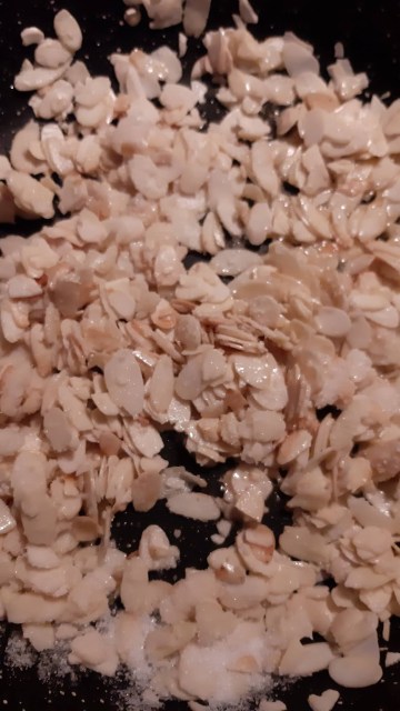 • После изсипах в тиган бадемите, добавих маслото и поизпекох до златист цвят.