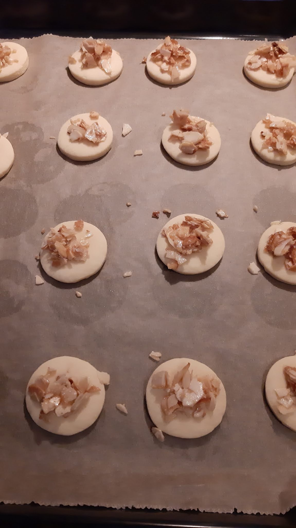 • Останалите 32 сладки пекох по 5 минути, изваждам, покривам с бадеми и допичам за още 5 минути. Но и тук времето е различно, в зависимост от фурната.
