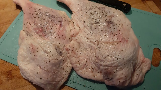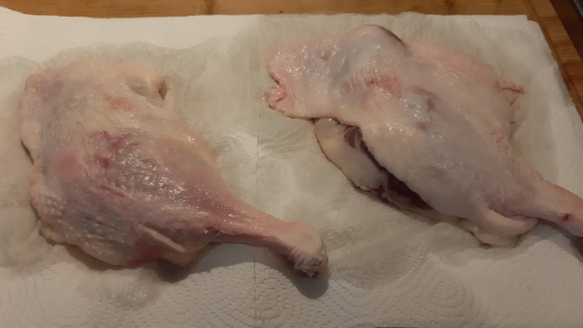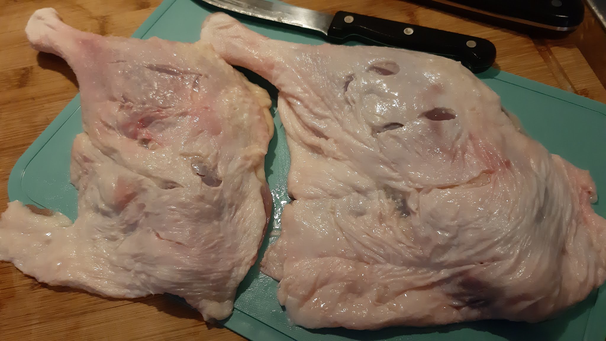 - С остър нож цепвам на няколко места кожата, но се старая да не засягам месото. Прави се с цел лесно да излезе подкожната мазнина по време на приготвянето.