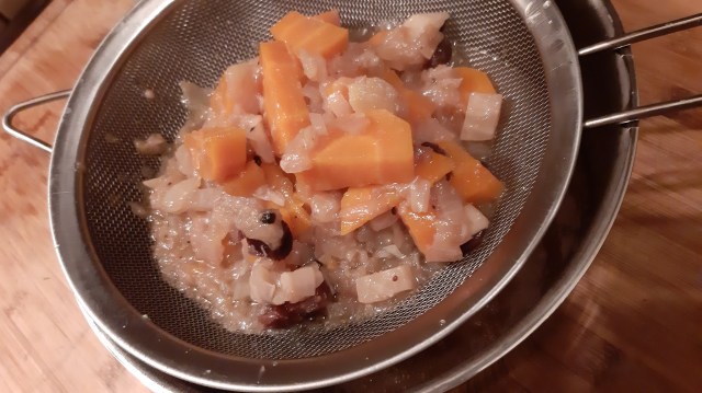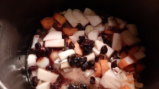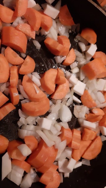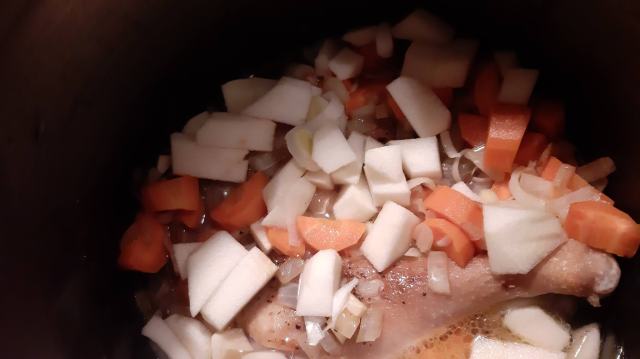 - В мазнината от бутчетата изпържвам нарязаните на едро зеленчуци за супа за около 3 минути. В моите има част от глава целина, моркови, кромид лук.