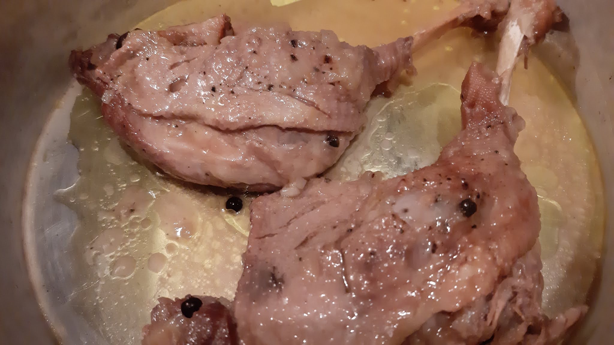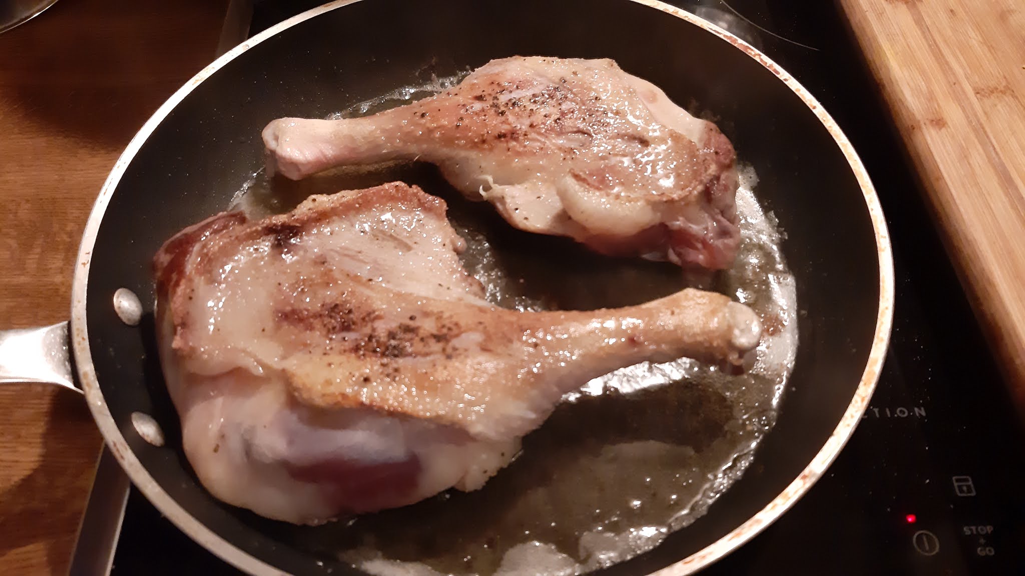 - Извадих бутчетата и сложих в тавичка за печене, а образувалата се мазнина по време на готвенето извадих с лъжица и добавих към бутчетата.