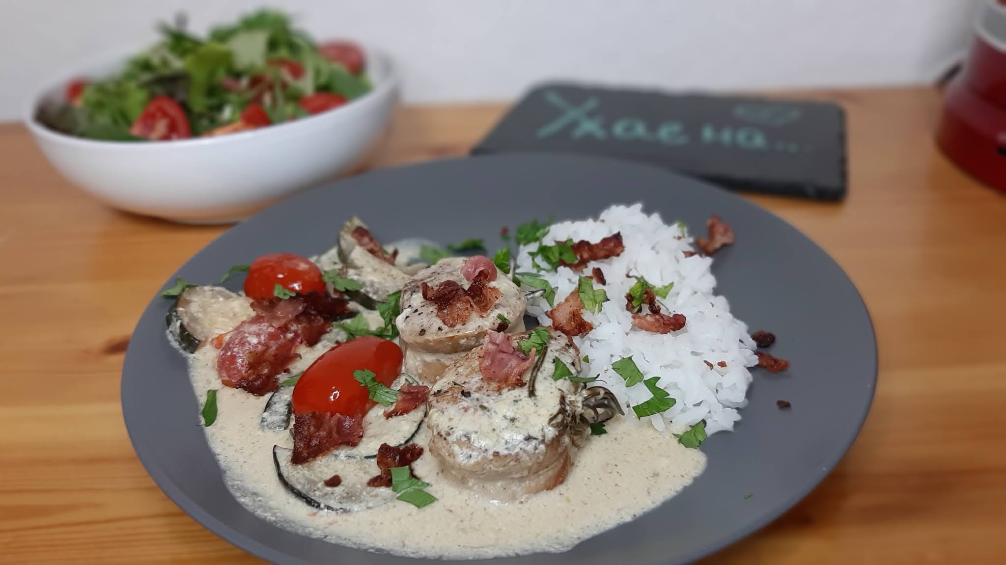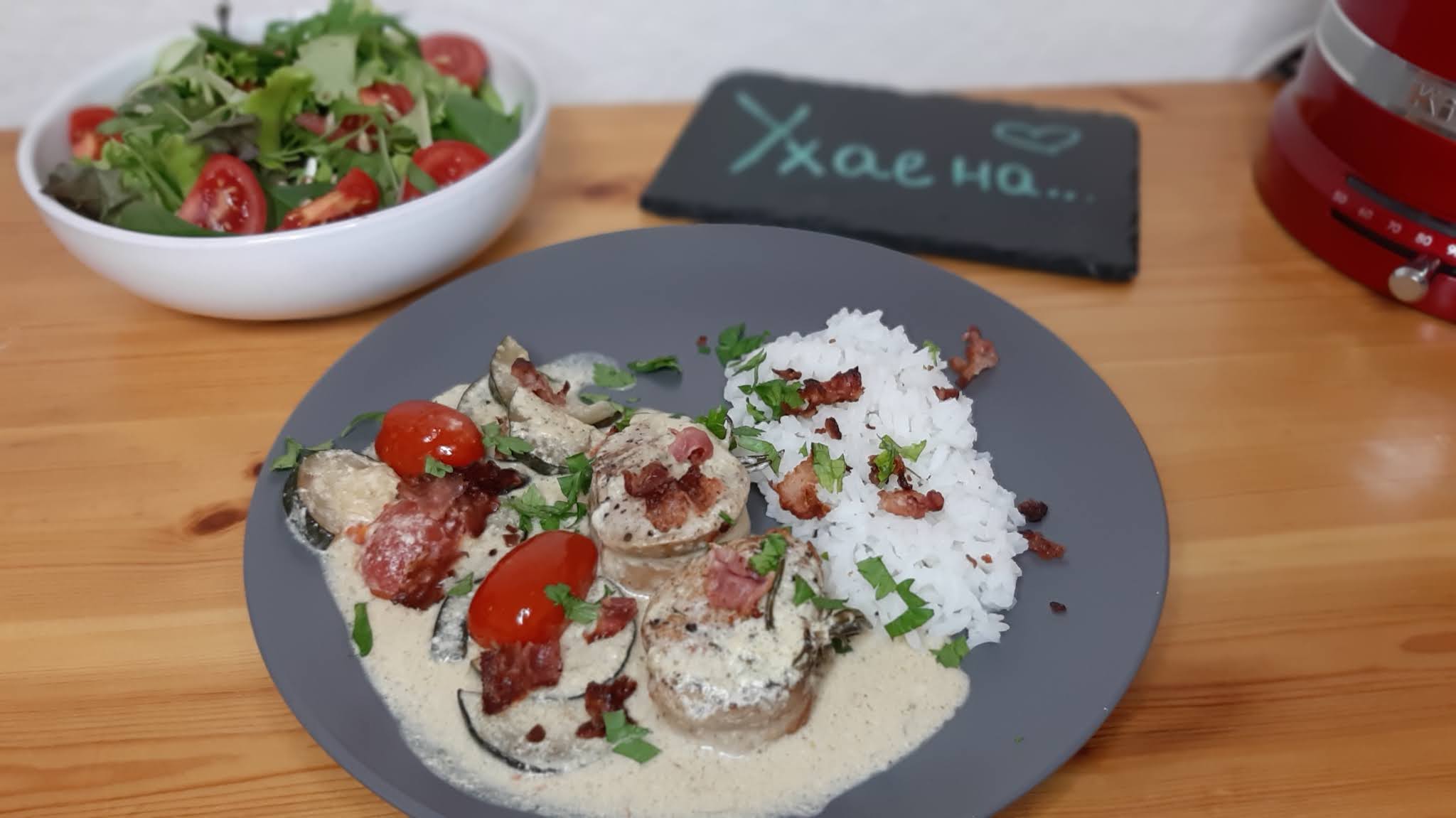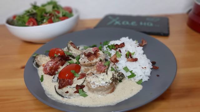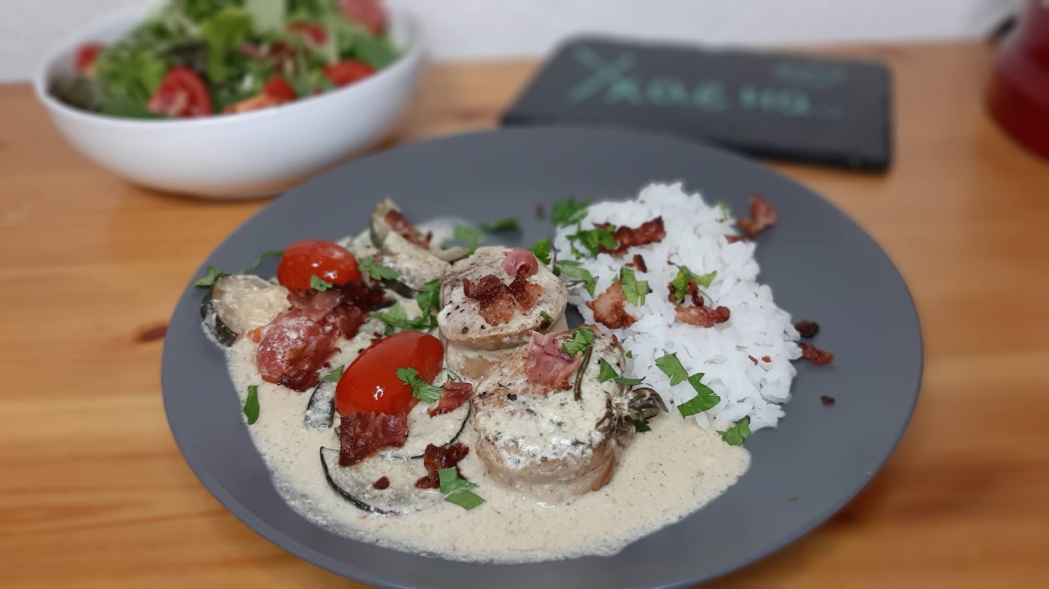 Днес Ви предлагам един мой прочит на вкусно свинско филе със сос от крема сирене, чери доматки и тиквички.