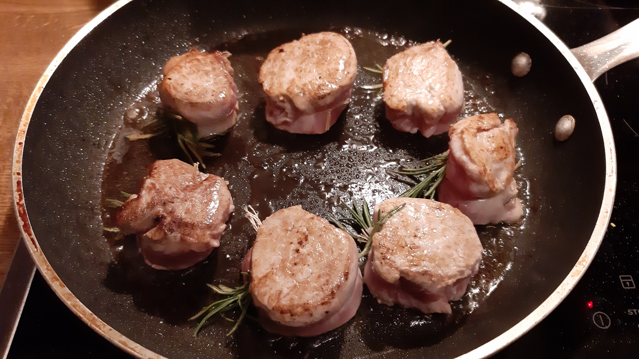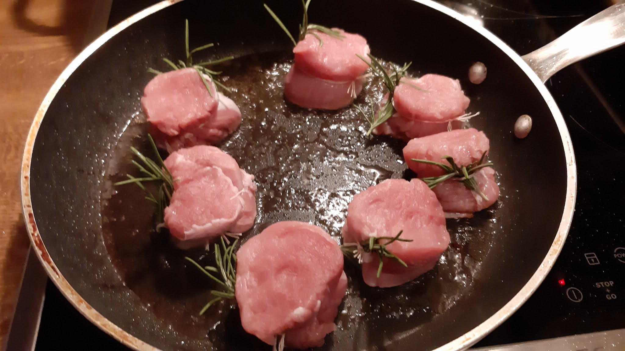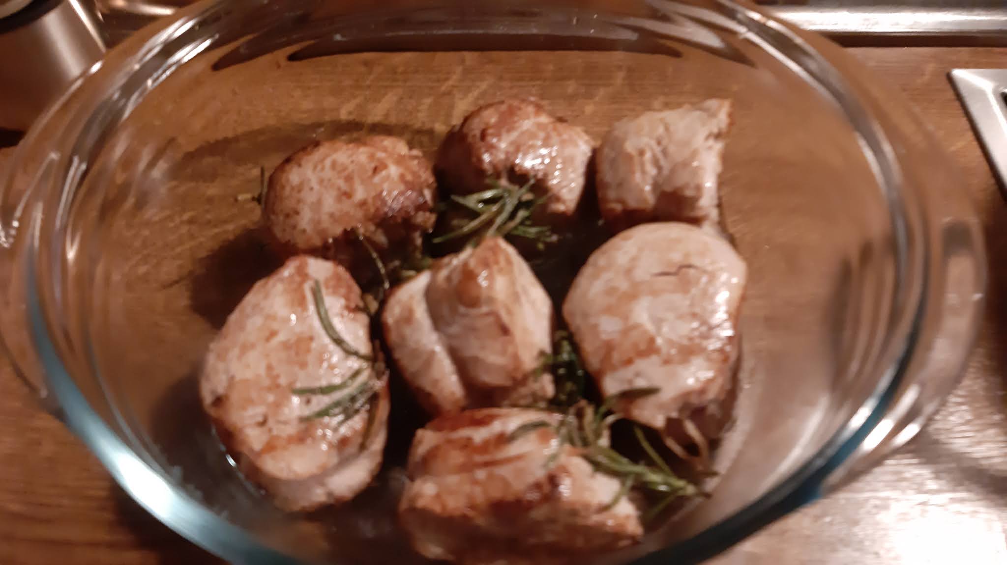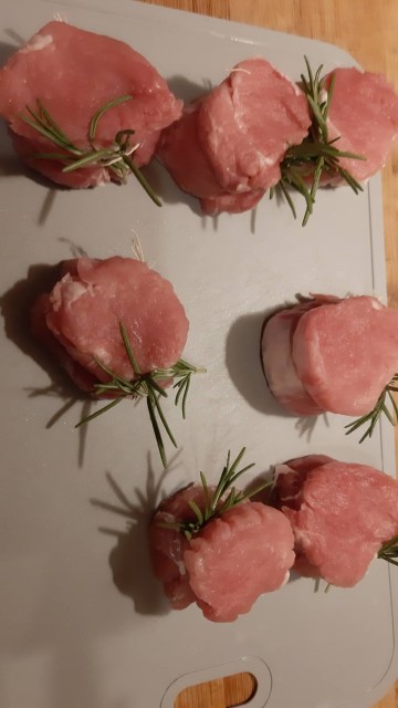- На всяко филе вързах с готварски конец розмарин и така му дадох и форма, която не се промени по време на готвенето.