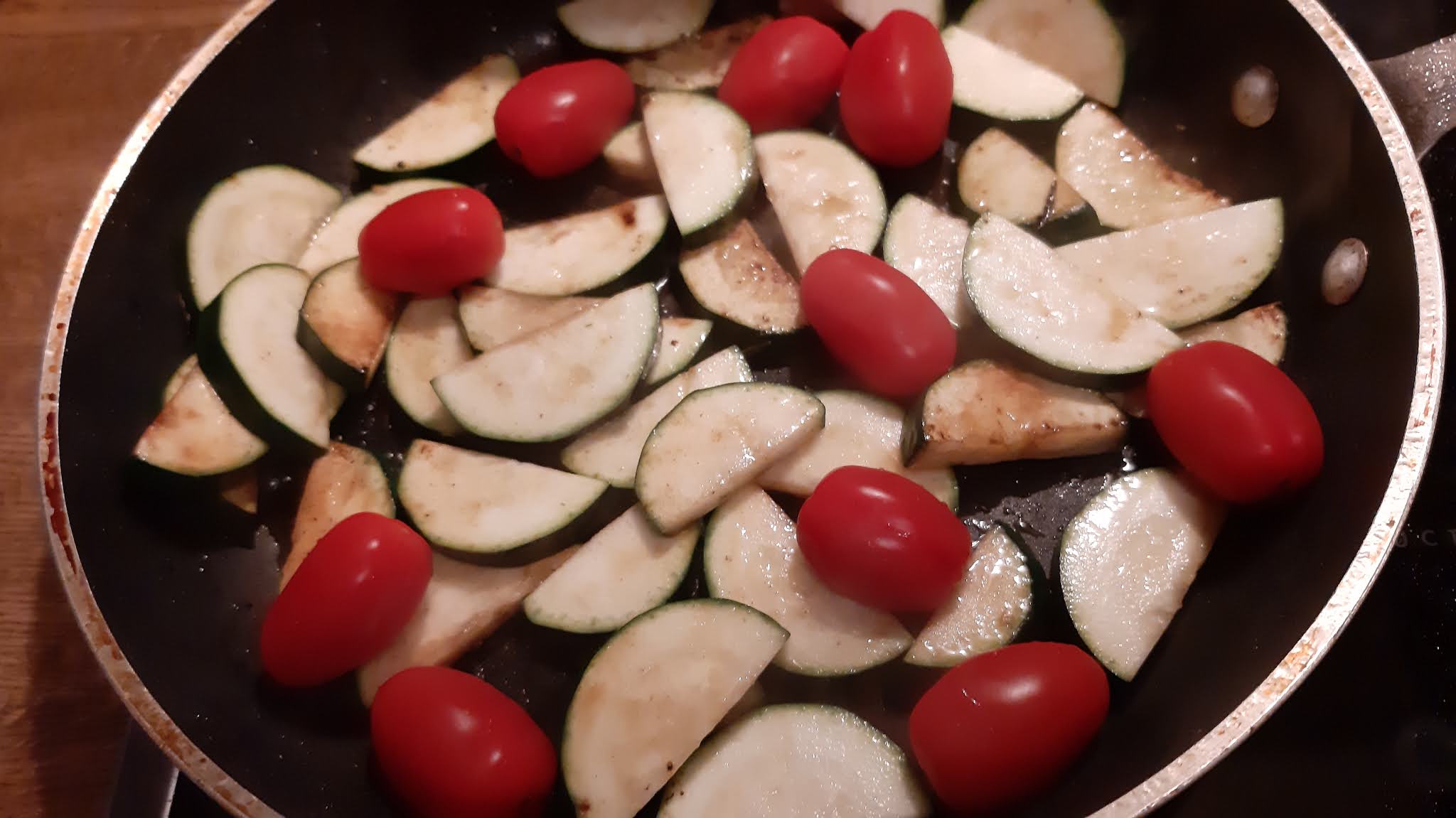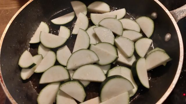 - В мазнината от филетата и бекона изпържихх нарязаните на дебели полумесеци тиквички.