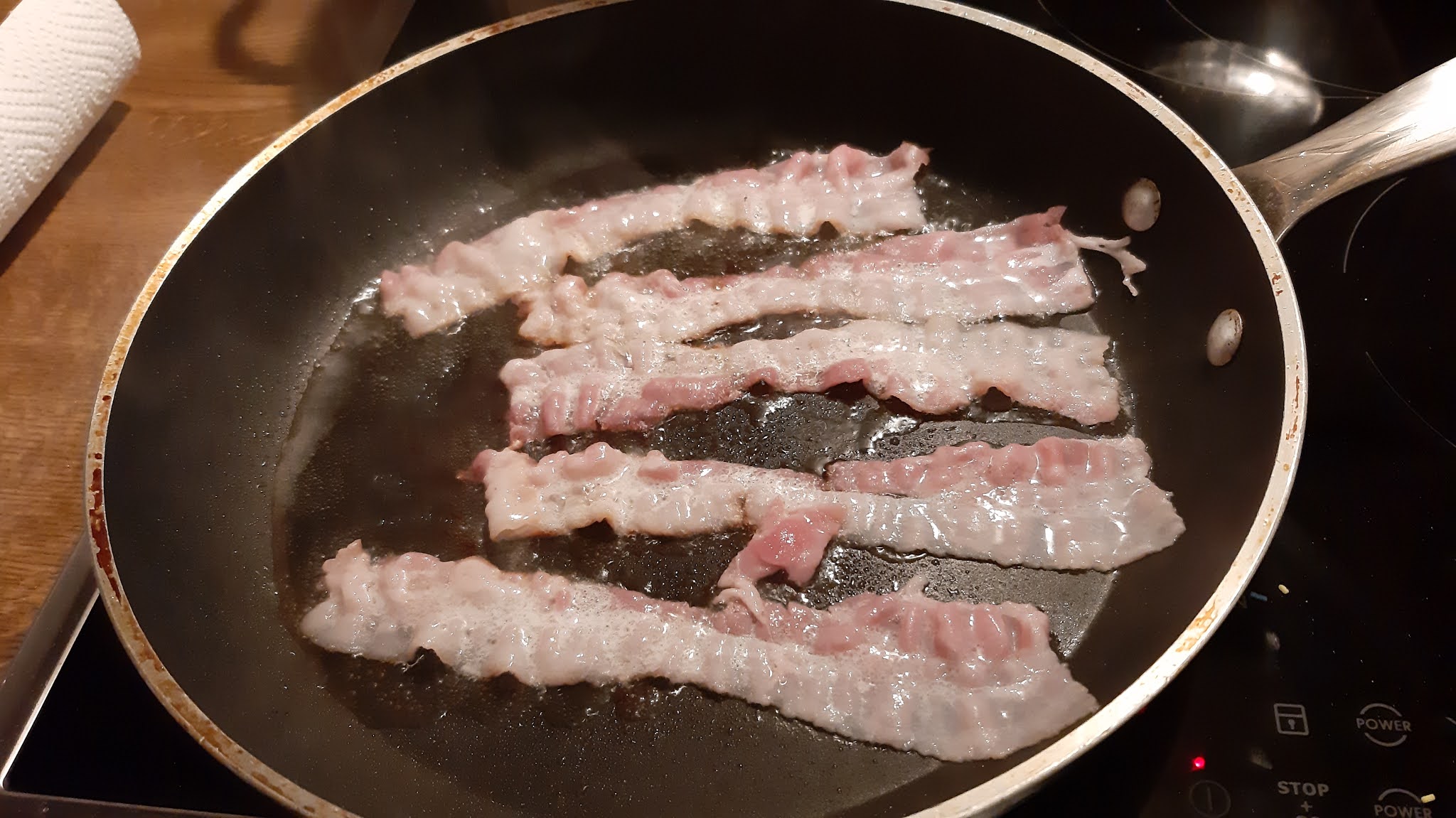 - Загрях олиото в тиган и изпържих до хрупкавост бекона.