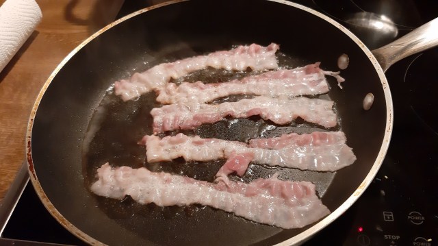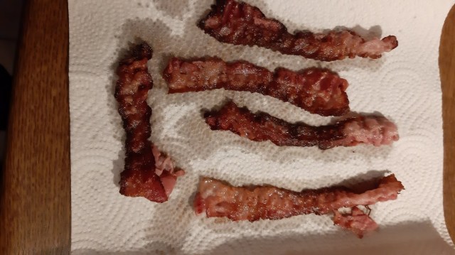 - Извадих бекона върху домакинска хартия. Така остава хрупкав.