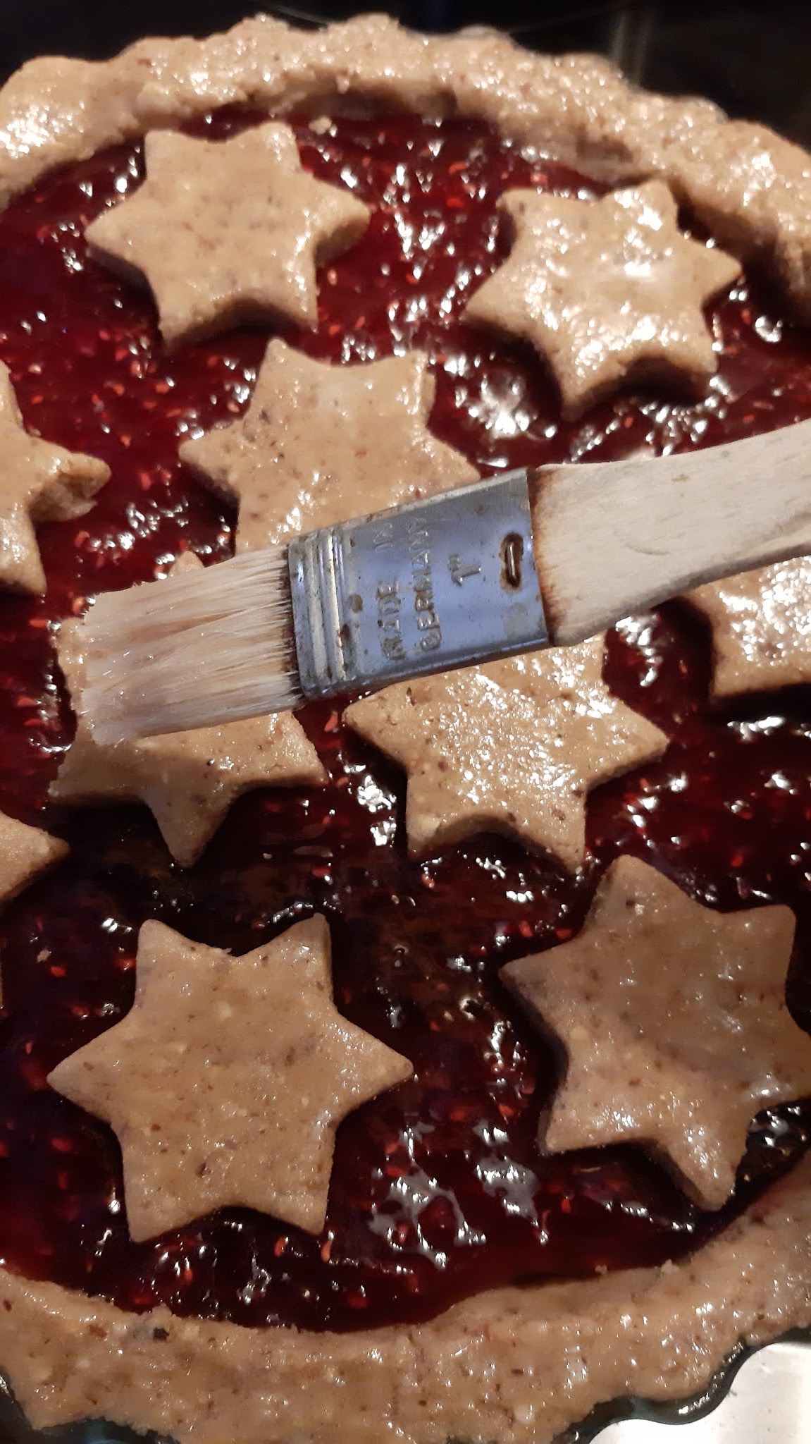 - Леко разбърквам белтъците от яйцата и намазвам звездите и ръбчетата на тортата.