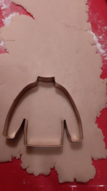 - Разточвам фондан в различни цветове до 3 мм дебелина и с помощта на формичките изрязвам пуловери (или формата, която сте избрали).