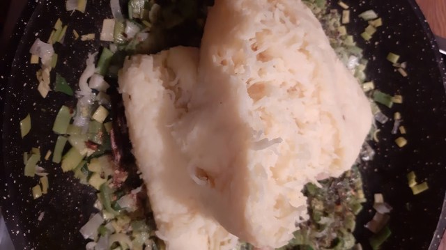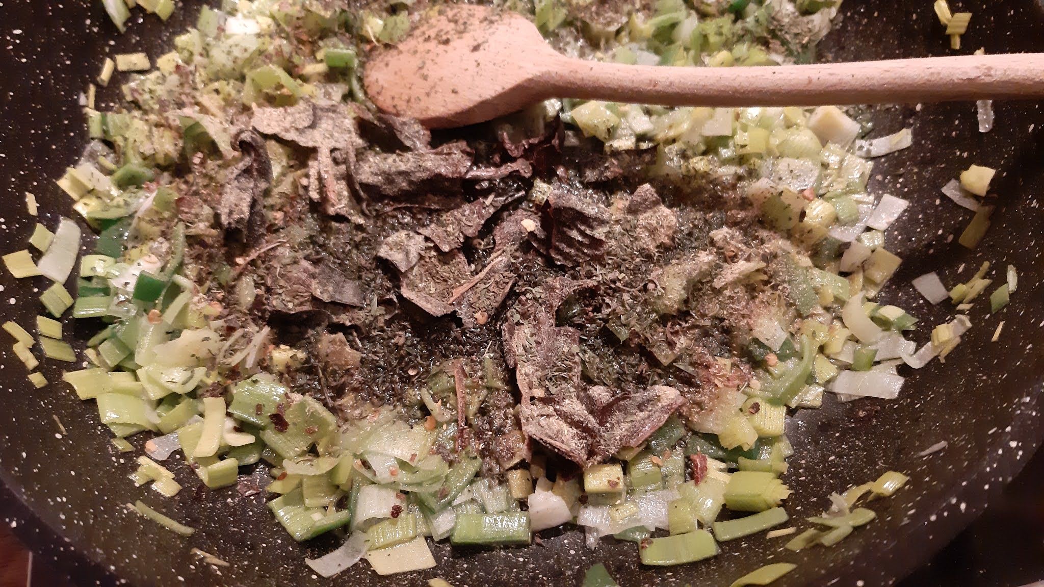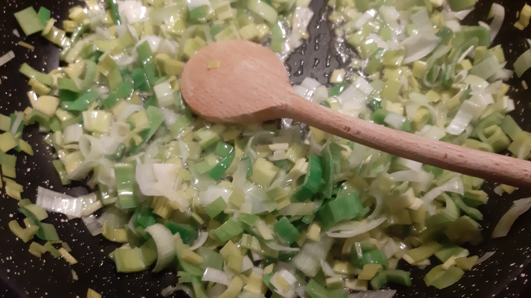 • Загрявам 2 с. л. от олиото и изпържвам до омекване нарязания на ситно праз лук. Немският е много твърд и суров не е добре да се добавя.