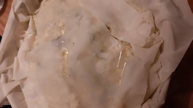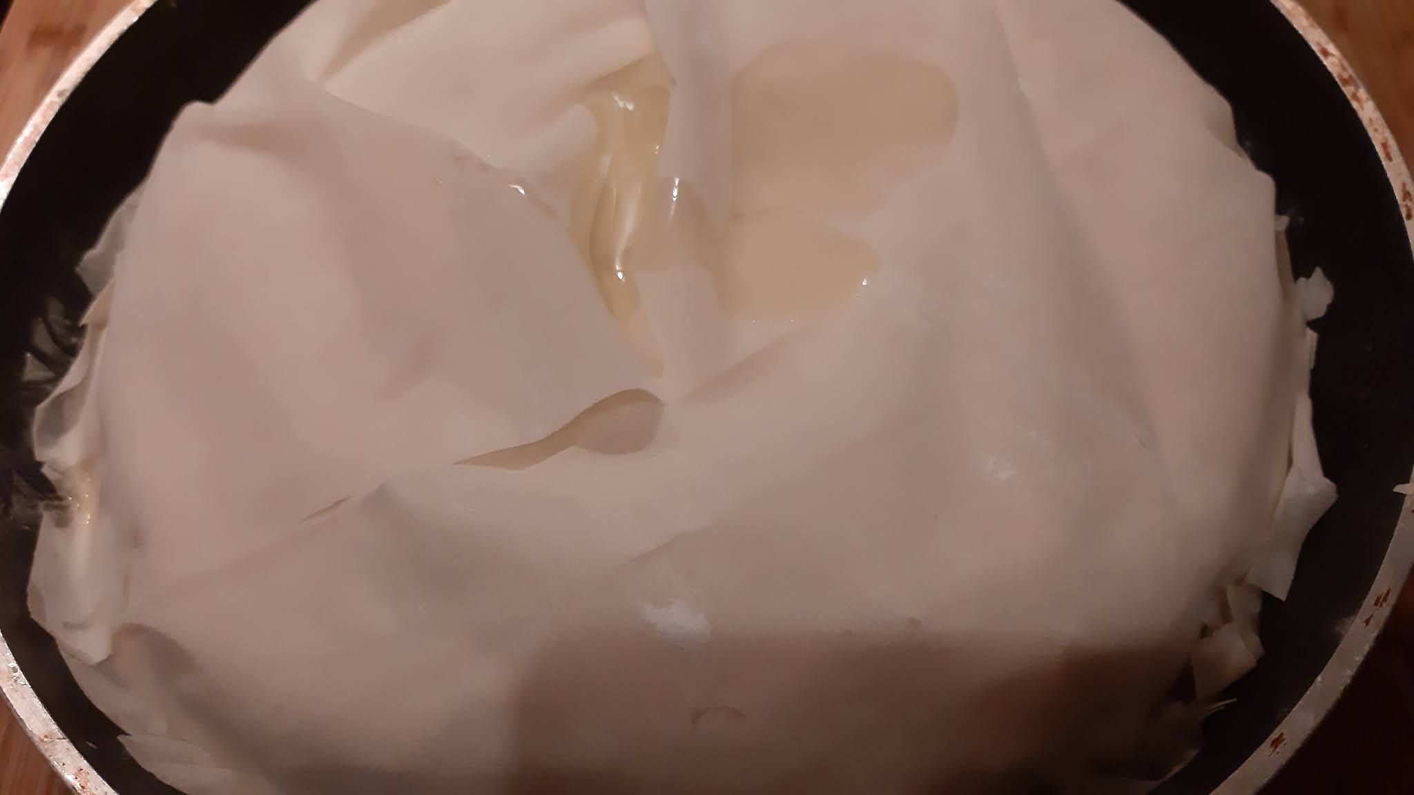 • Покривам с останалите кори като ги подпъхвам под плънката и помежду им също сипвам малко от олиот.