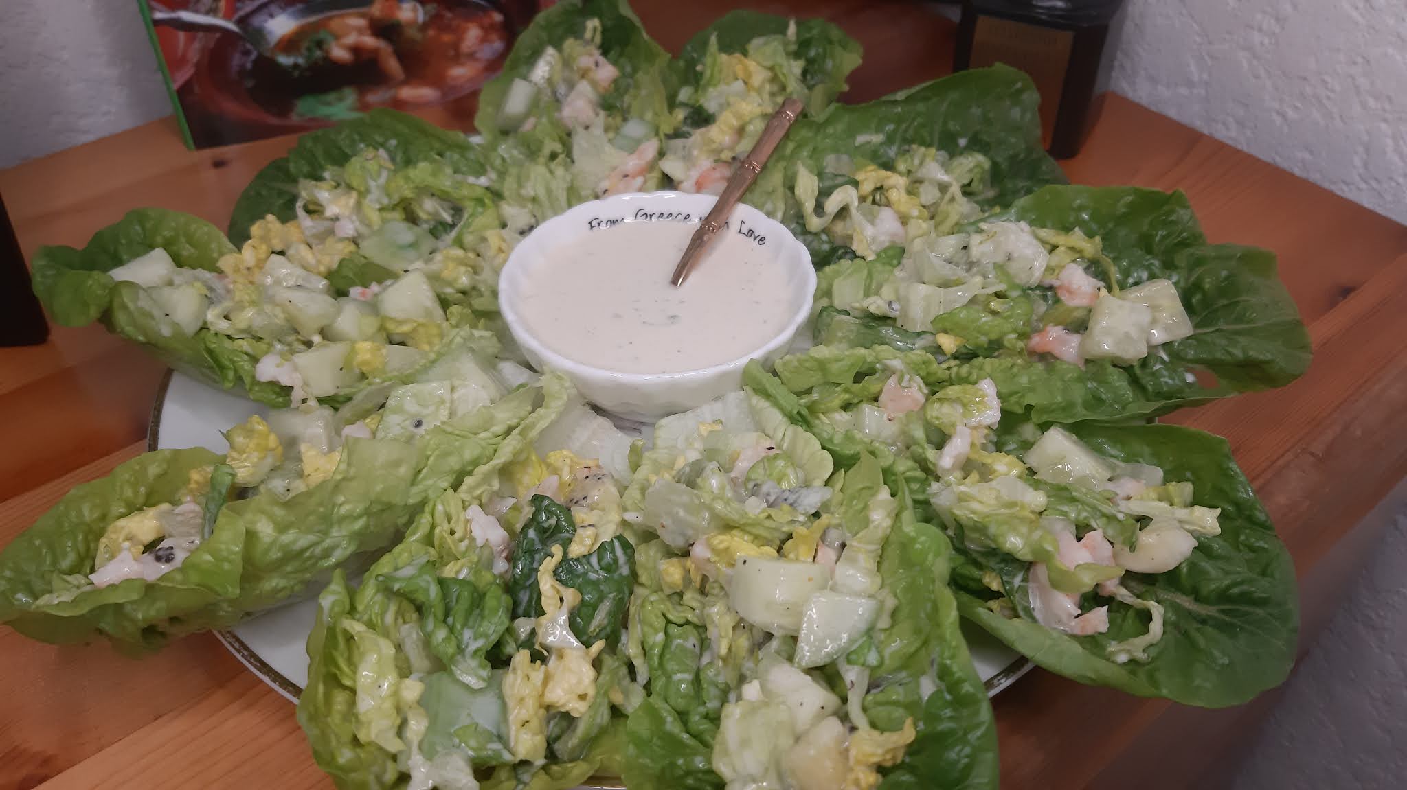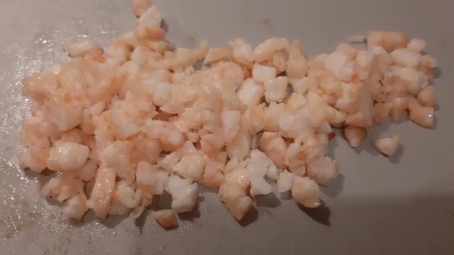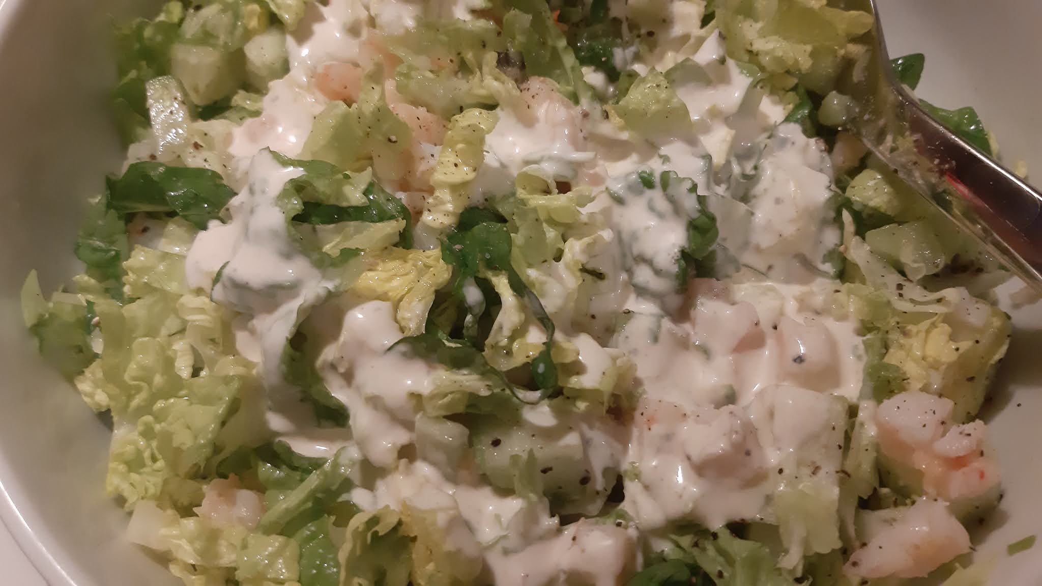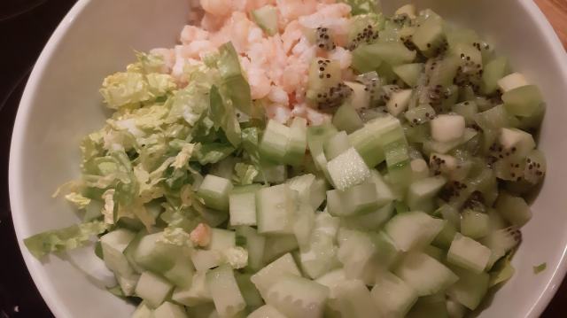 - Останалата салата нарязвам на ситно и в купа смесвам с кивито, скаридите, краставицата.