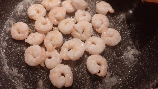 - Загрявам олиото в тиган и изпържвам скаридите за около 2 – 3 минути