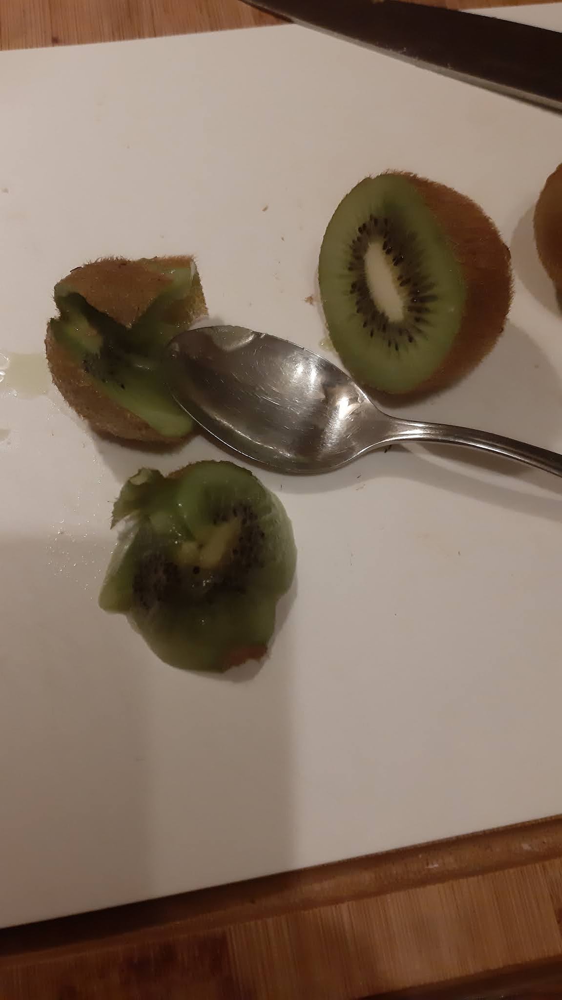 - Режа кивитата на половина и с лъжица издълбавам вътрешността им.