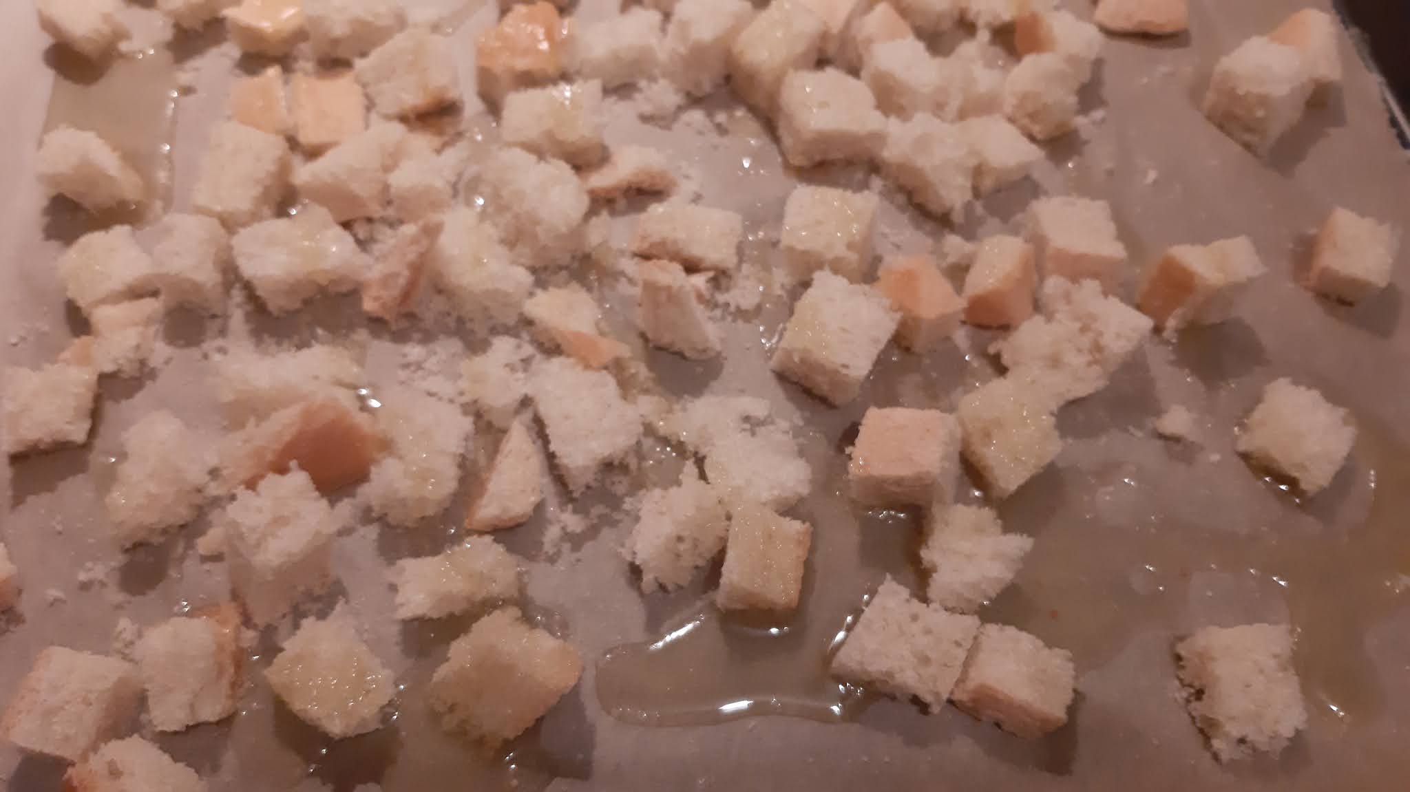 - Нарязвам хляба на малки кубчета и го слагам в тавата на фурната, покрита с хартия за печене.