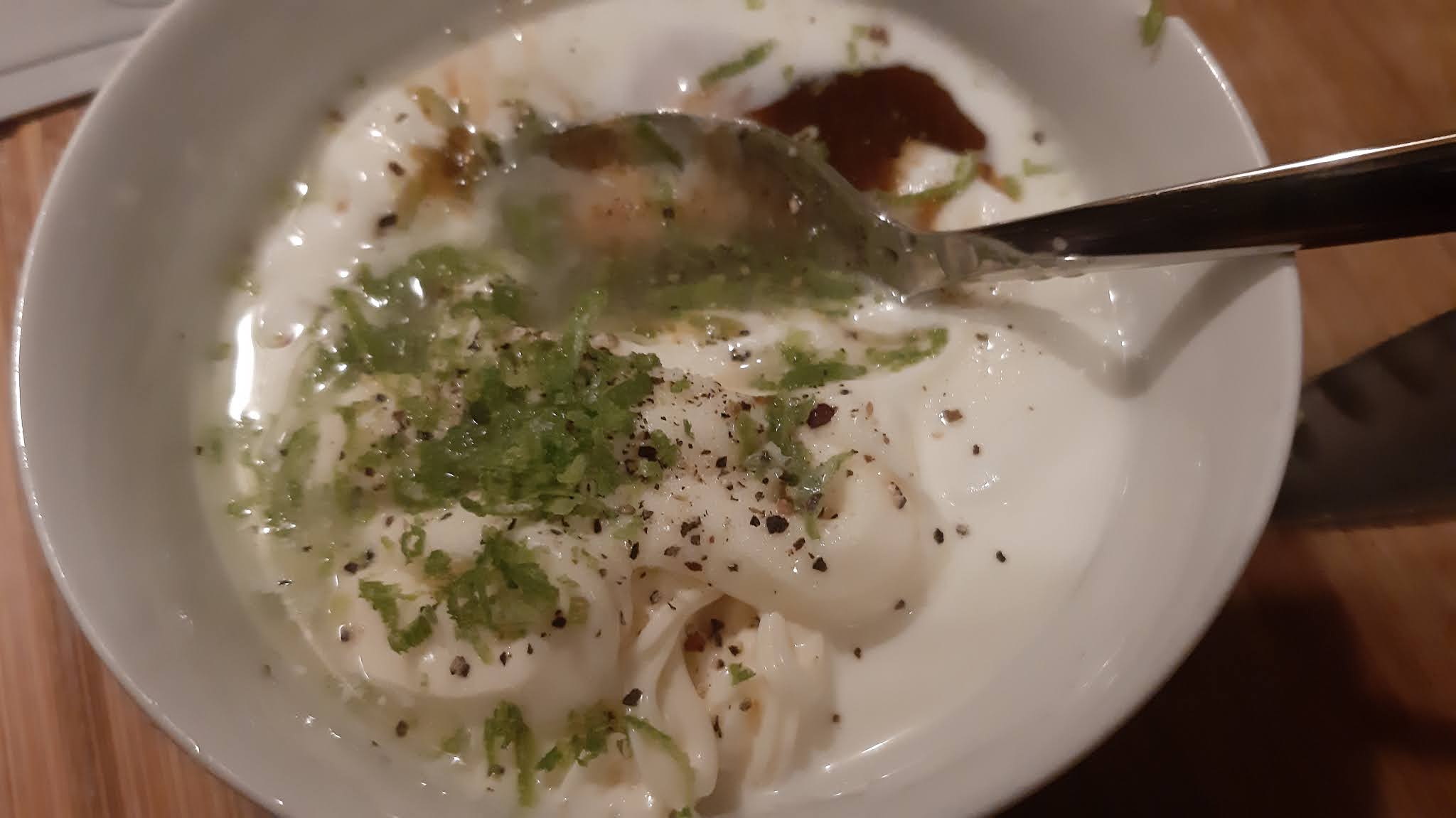 - В купичка смесвам йогурта, майонезата, кетчупа, настърганата кора на лимончето и сокът на половината лимонче.
